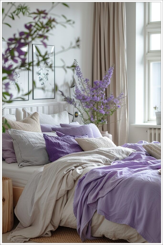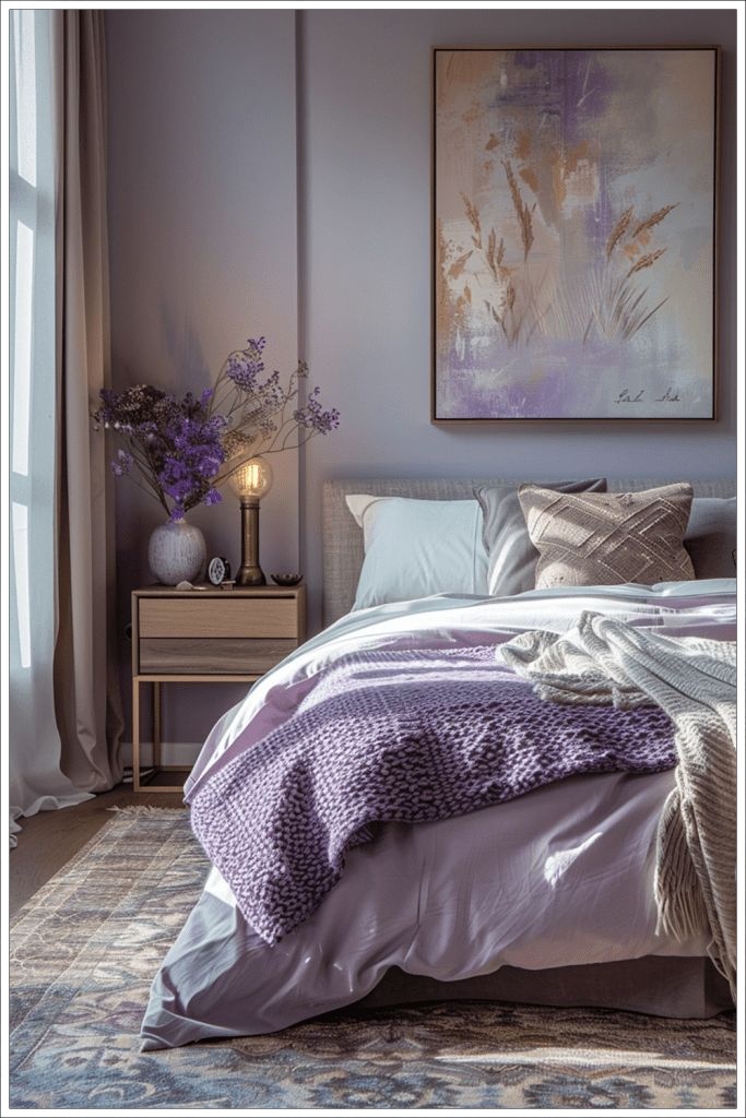 - Μαξιλάρια και ριχτάρια: Προσθέστε υφές και μοτίβα σε παστέλ μωβ και γκρι για επιπλέον στιλ.