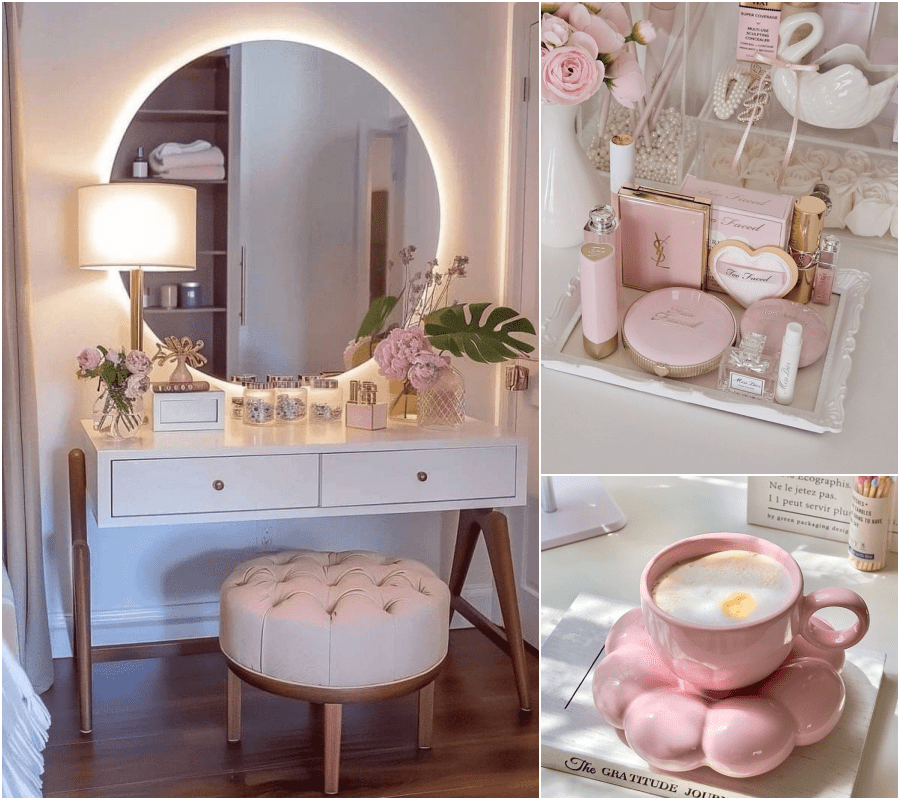 Διακοσμητικά κουτιά ή βιβλία: Κομψά κουτιά για αποθήκευση καλλυντικών ή ένα vintage βιβλίο ανοιχτό ως ντεκόρ.