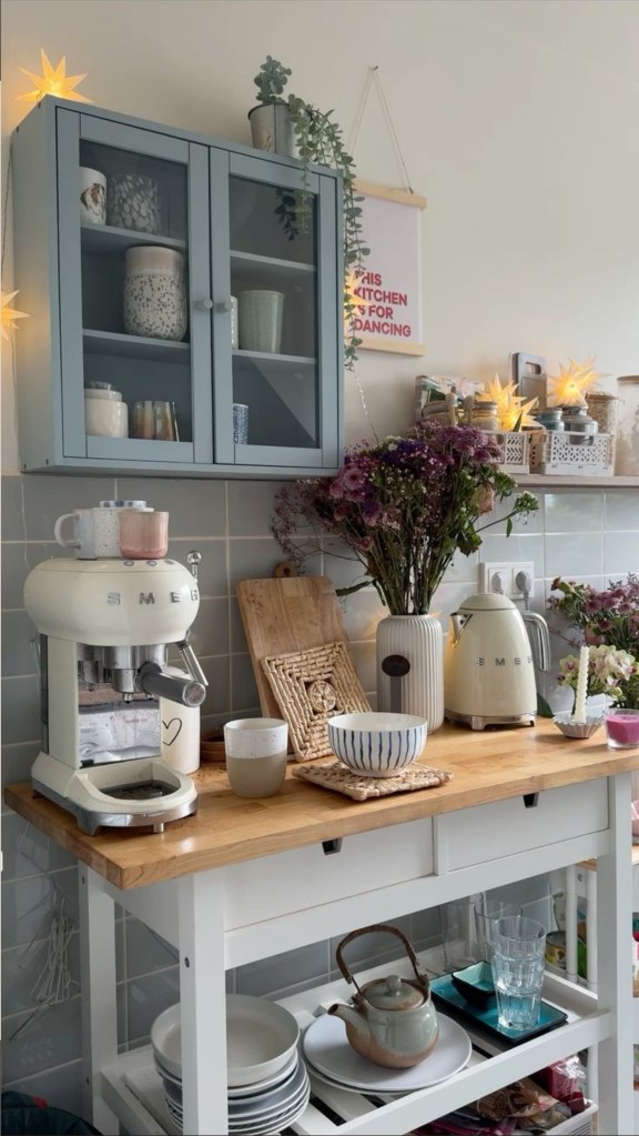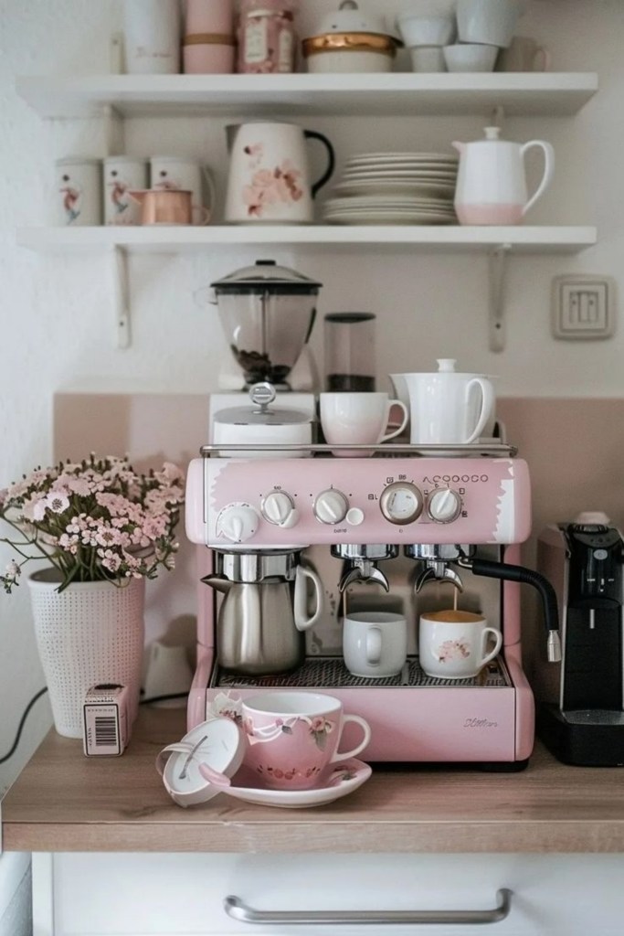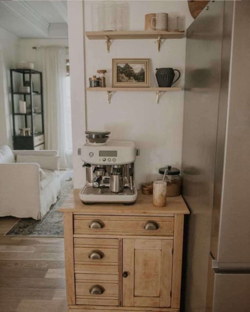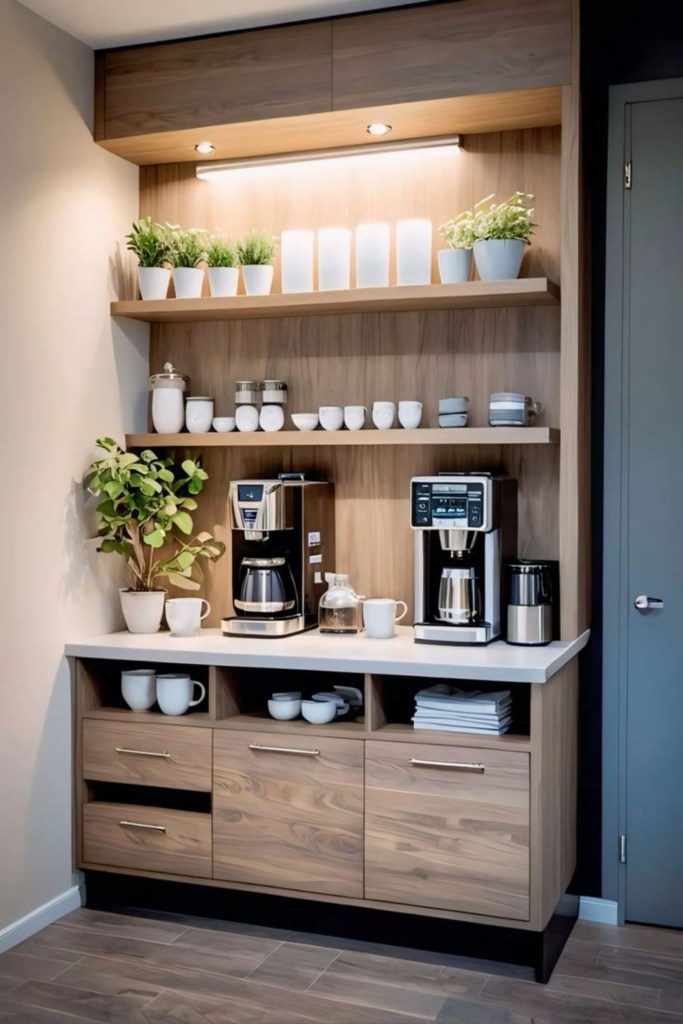 Μικρή γωνιά καφέ: Ένα στενό έπιπλο με ράφια για καφετιέρα, φλιτζάνια και καφέδες.