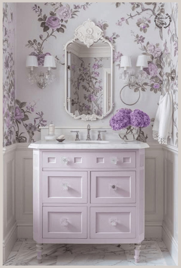 Μια ταπετσαρία σε χρώμα λεβάντας στο μπάνιο μπορεί να δώσει μια κομψή και χαλαρωτική αίσθηση, αρκεί να επιλέξεΤΕ ανθεκτικά υλικά κατάλληλα για υγρασία.