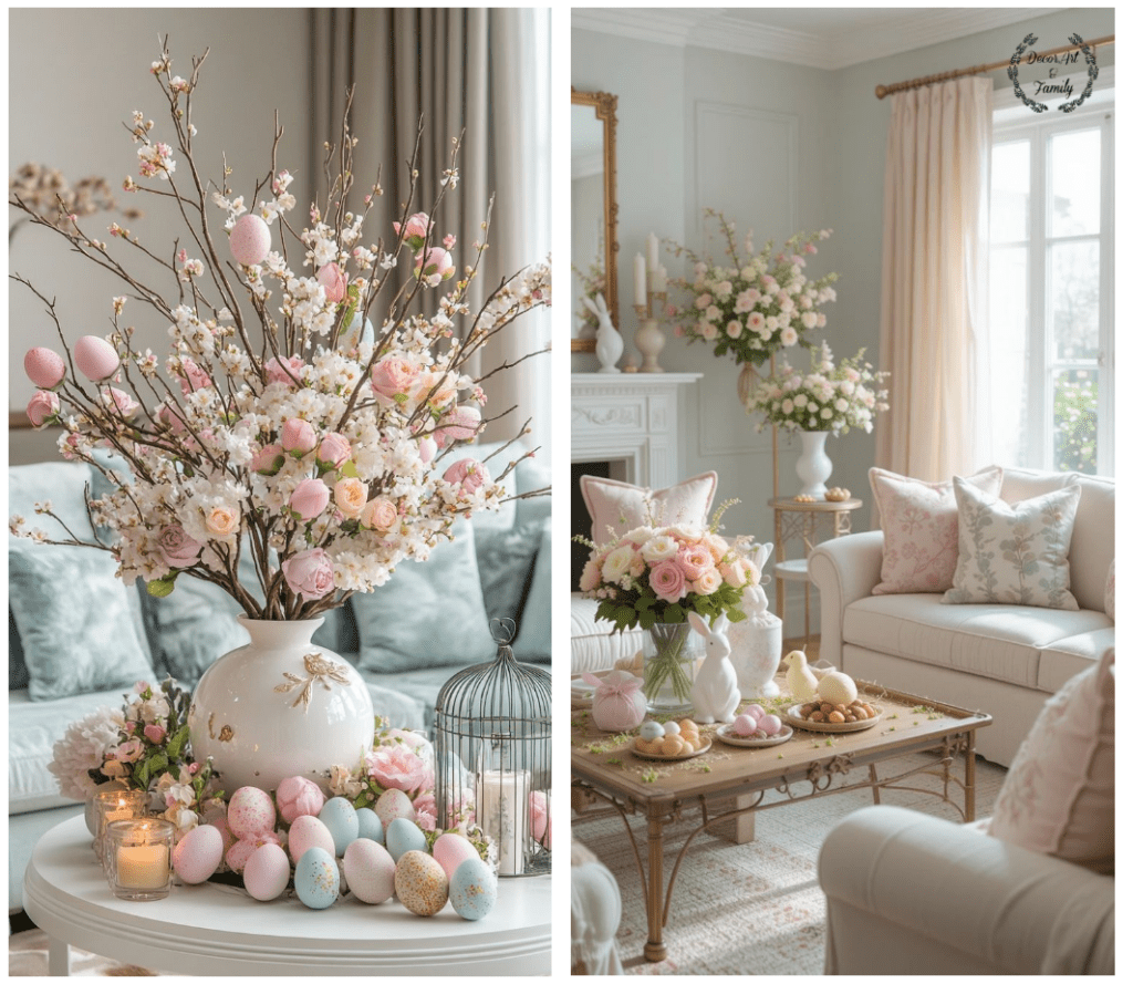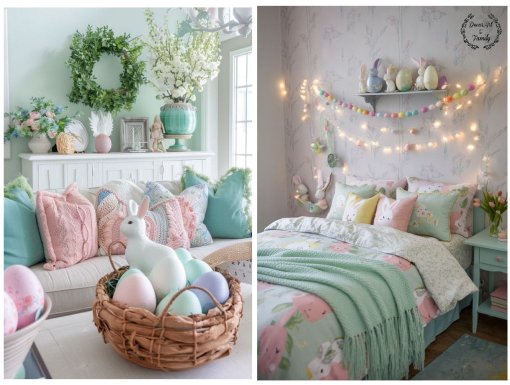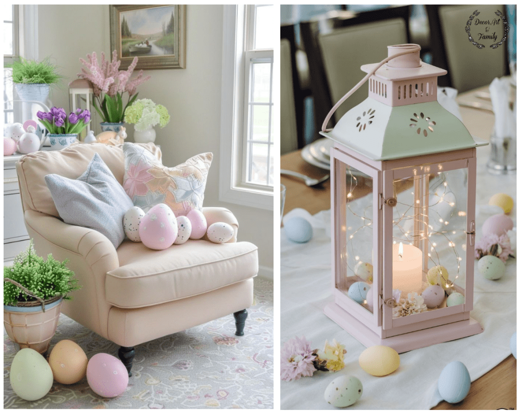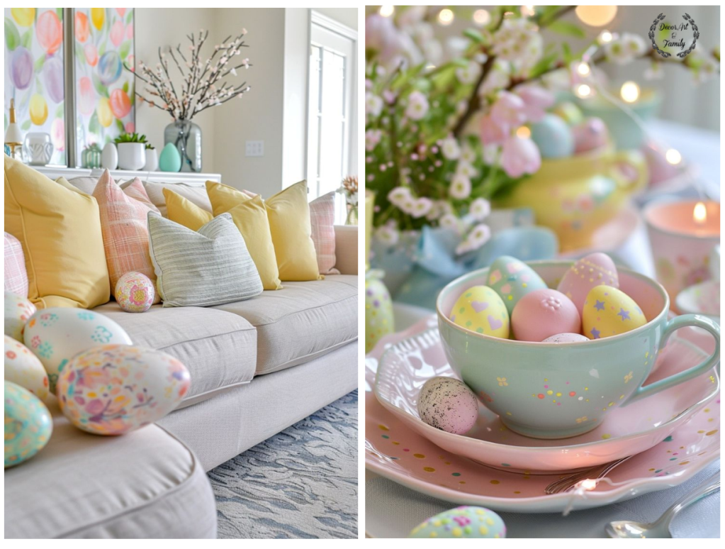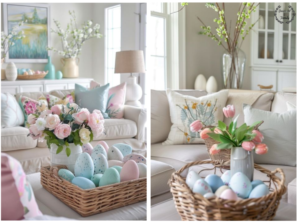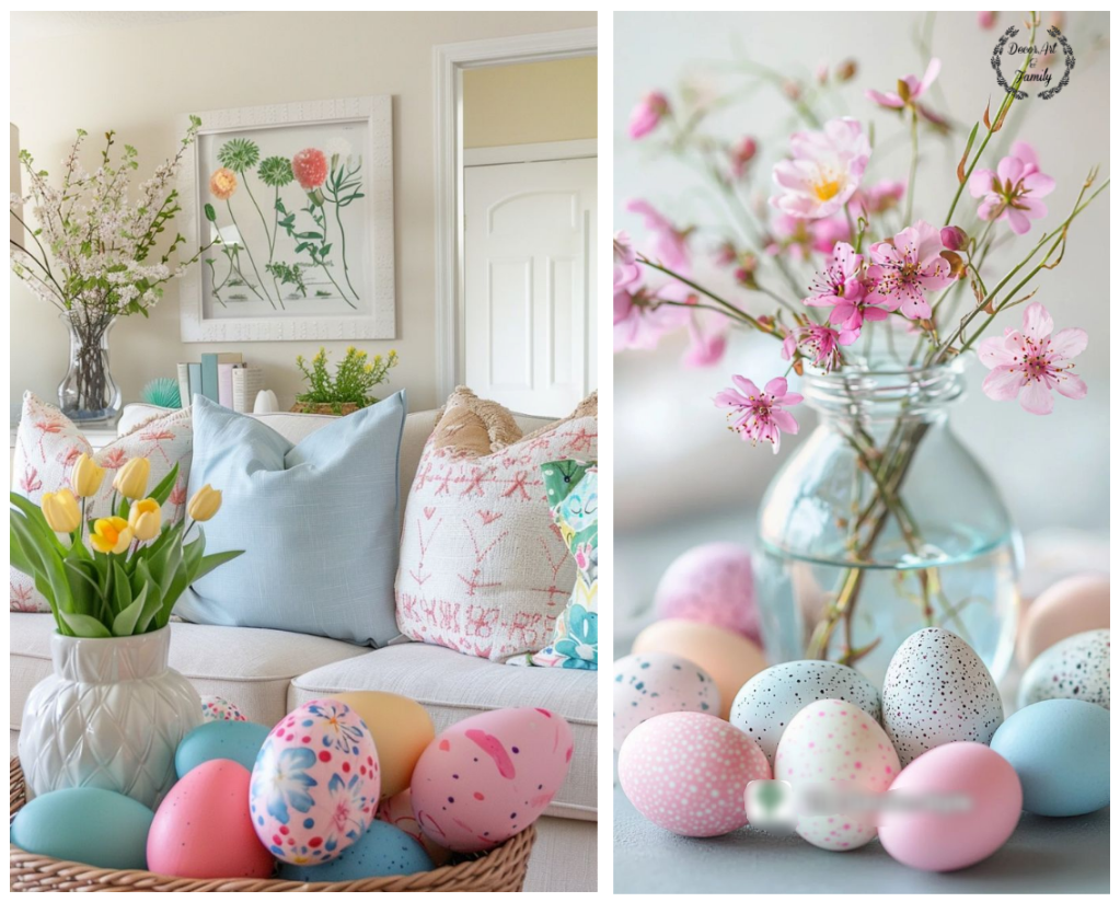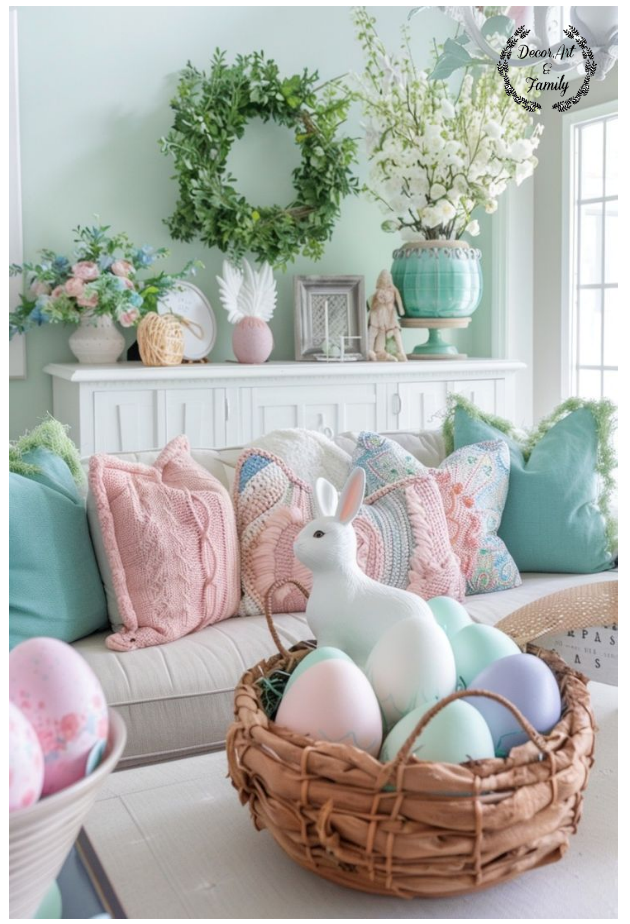 Εδώ σας δίνω τα τρία παστέλ χρώματα που θα δημιουργήσουν την πιο ρομαντική και ανοιξιάτικη ατμόσφαιρα στο σαλόνι σας. Το απαλό αμυγδαλί χρώμα(mint), το ρόζ παστέλ και το λιλά….Μην ξεχνάτε ότι μια μικρή δέσμη από λουλούδια είναι απαραίτητη ιδίως αν τοποθετήσετε ανάμεσα τους Πασχαλινά αυγουλάκια που έχετε κάνει ντεκουπάζ.