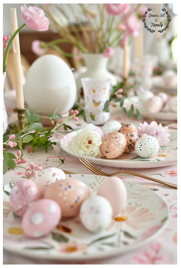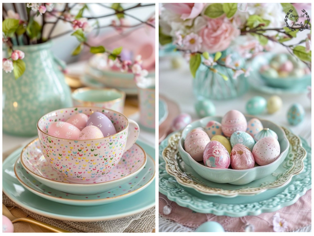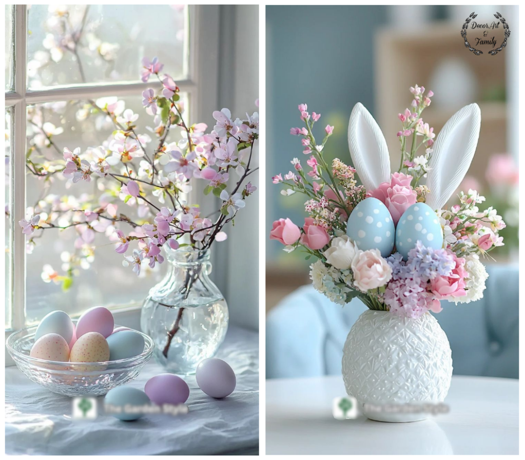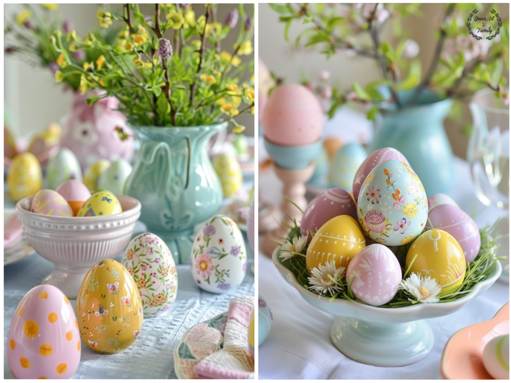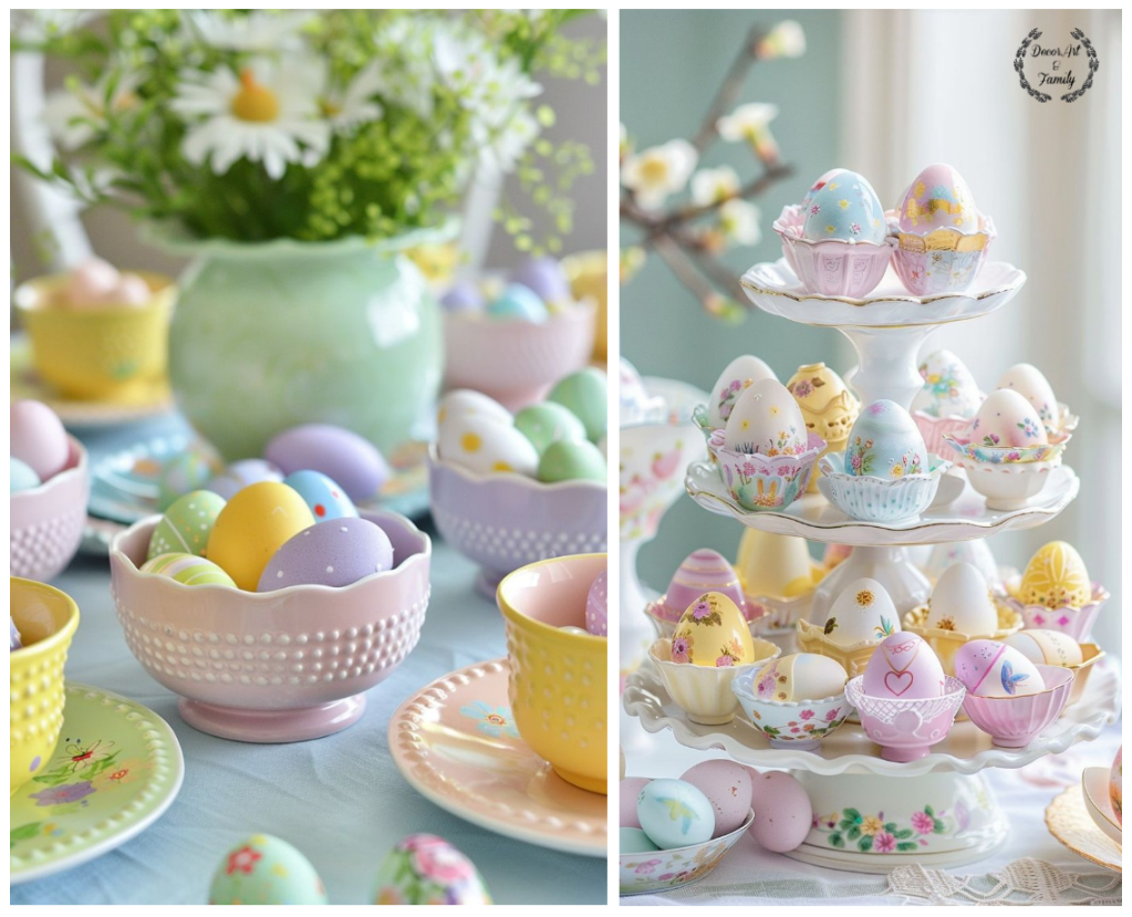Αυγά σε Παστέλ Χρώματα: Βάψτε αυγά σε απαλές αποχρώσεις και τοποθετήστέ τα σε διακοσμητικές ψάθινα καλαθάκια ή γυάλινα μικρά δοχεία..