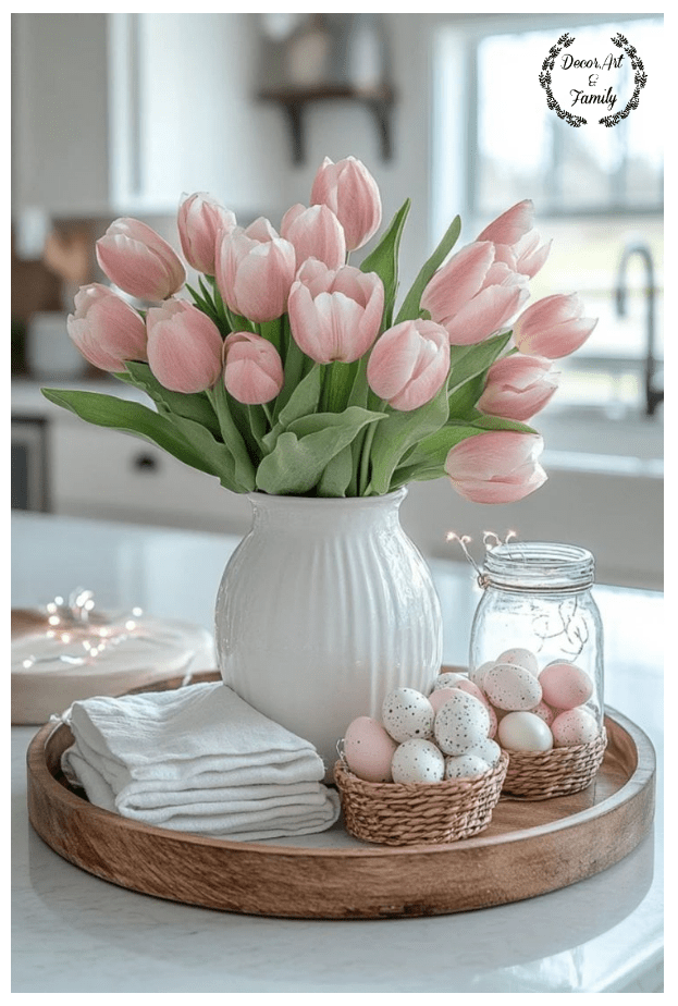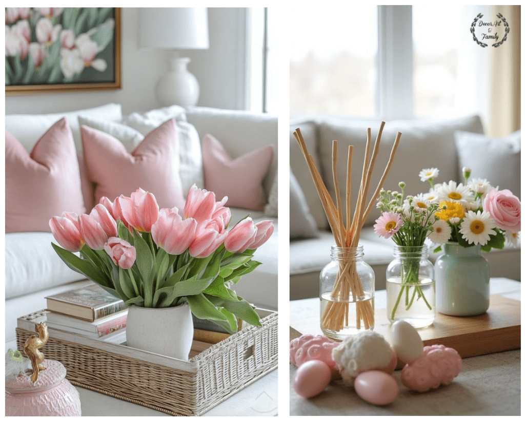 Λουλούδια: Κίτρινες ή λευκές τουλίπες, ροζ πασχαλιά σε γυάλινα βάζα.