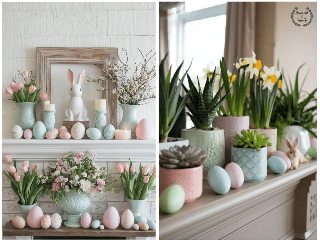 Πασχαλινή διακόσμηση στο τζάκι με παστέλ αποχρώσεις. Προσθέστε παστέλ αυγά, κεραμικά λαγουδάκια και κεριά. Εναλλακτικά μπορείτε να βάλετε κεραμικά στοιχεία σε διαφορετικά χρώματα και ύψη ,τοποθετώντας μικρά παχύφυτα. και λουλούδια..