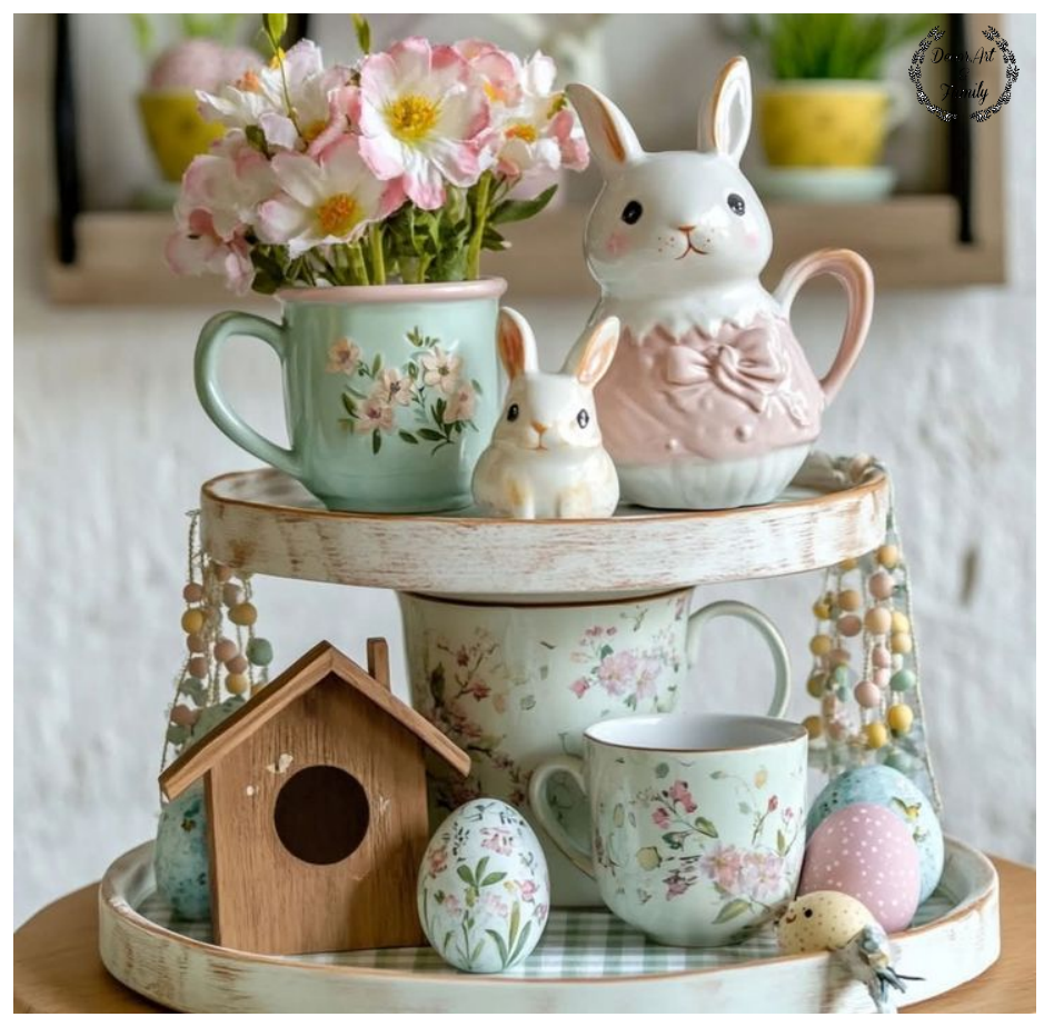 Χρησιμοποιήστε σε έναν ξύλινο ή μεταλλικό δίσκο για ρουστίκ αισθητική. Βάλτε διακοσμητικά στοιχεία με floraμοτίβα και τοποθετήστε αυγά. Προσθέστε διακοσμητικά λαγουδάκια ή μικρά κεραμικά στοιχεία.