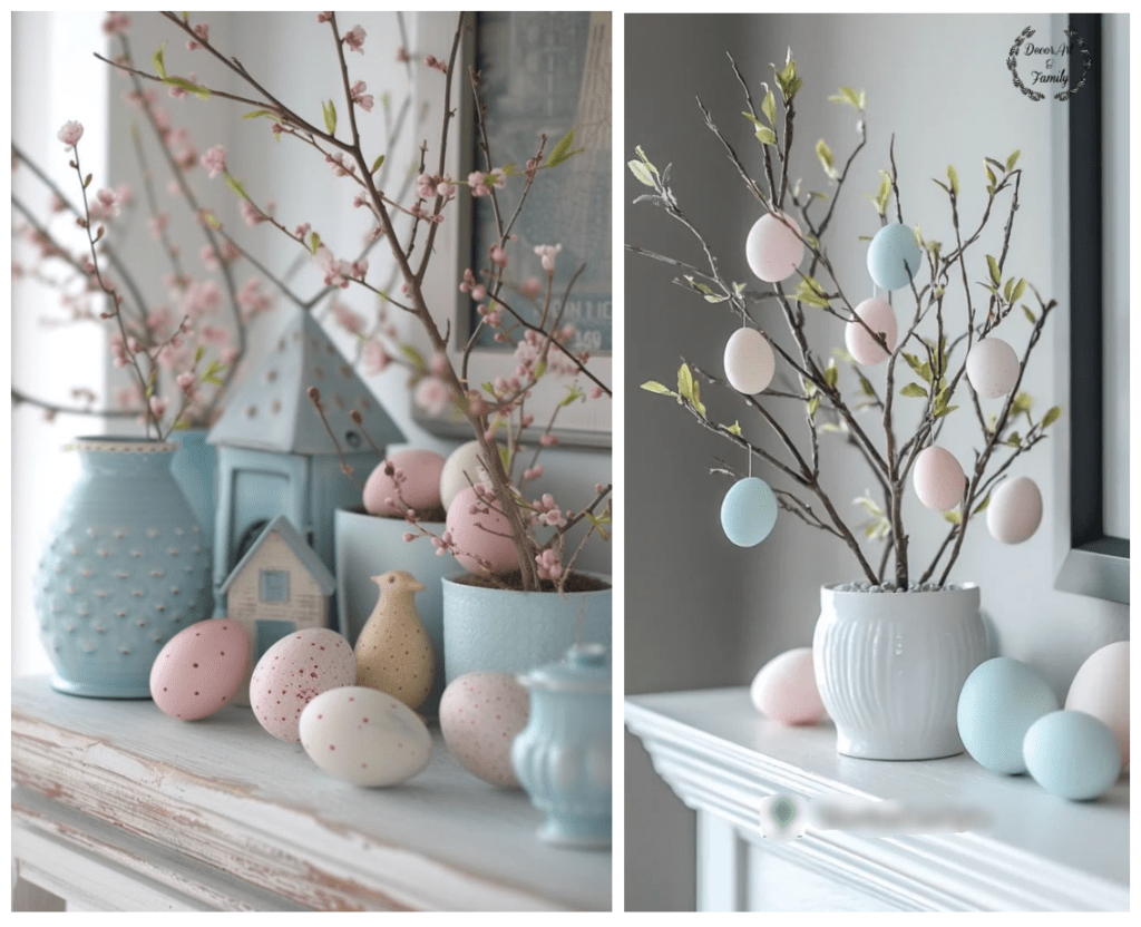 Επάνω σε επίπεδες επιφάνειες βάλτε εναλλάξ αυγά και μικρά λουλούδια, μαζί με βάζα σε μικρό μέγεθος όπως μανουσάκια τουλίπες ή λευκές πασχαλιές. Χρησιμοποιήστε κεριά σε παστέλ χρώματα για πιο ρομαντική ατμόσφαιρα.