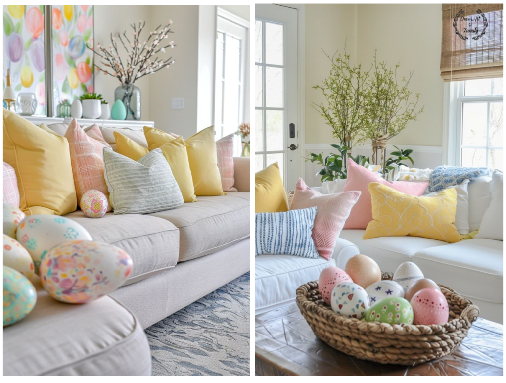 Διακοσμητικά Μαξιλάρια: Προσθήκη μαξιλαριών σε απαλές αποχρώσεις με λουλουδάτα ή πασχαλινά σχέδια.Ζωγραφίστε μικρά λουλούδια, φυλλαράκια ή κλαδάκια με ακρυλικά χρώματα ή μαρκαδόρους.