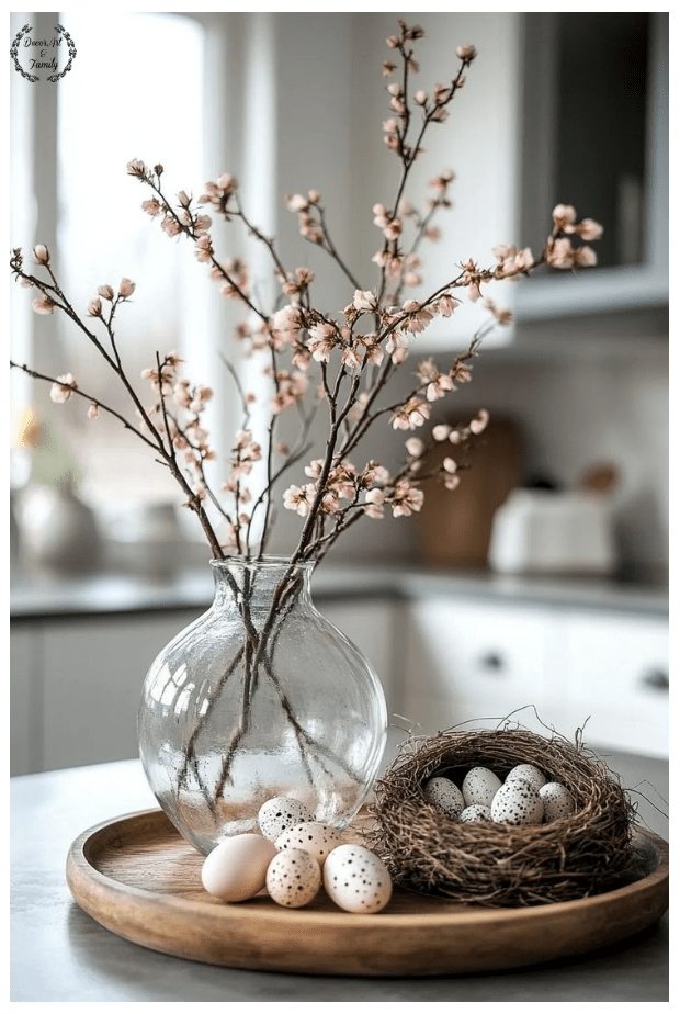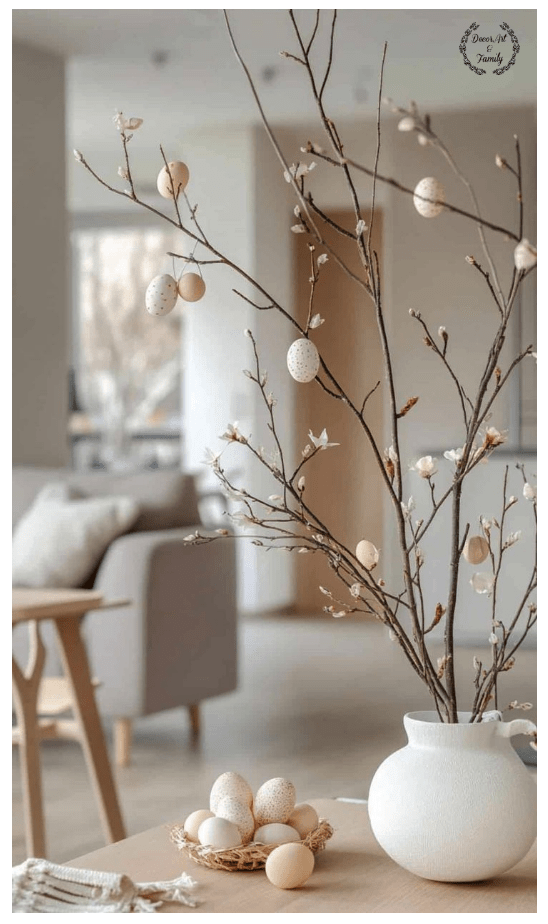 Τοποθετήστέ τα στο βάζο: Στερεώστε κλαδιά σε ένα όμορφο βάζο ή κασπώ χρησιμοποιώντας πέτρες ή αφρό ανθοπωλείου. Διακοσμήστε τα κλαδιά: Κρεμάστε παστέλ αυγά με κορδελίτσες ή σπάγγο. Μπορείτε να τα στολίσετε με μικρά λουλούδια, ή άλλα στοιχεία.