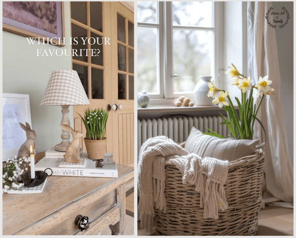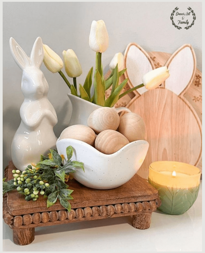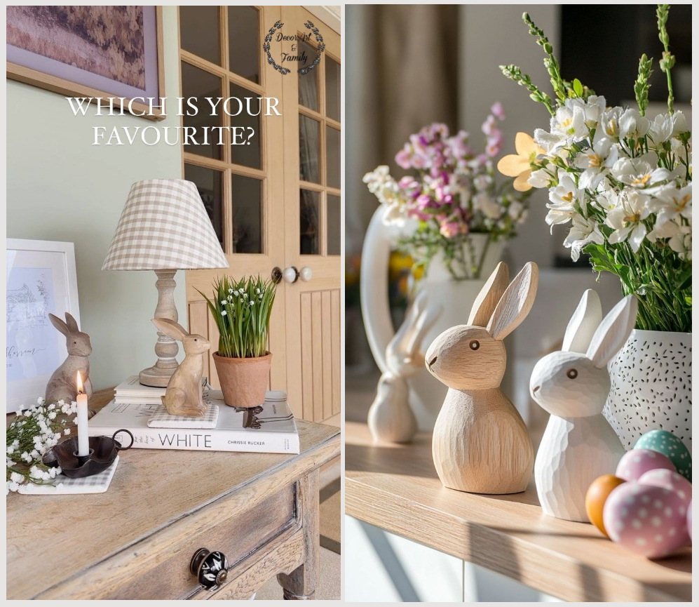 Τα ξύλινα λαγουδάκια πάνω στην κονσόλα είναι το απόλυτο rustic διακοσμητικό — απλό, γλυκό και τόσο ταιριαστό με το φυσικό, πασχαλινό vibe που θέλετε.