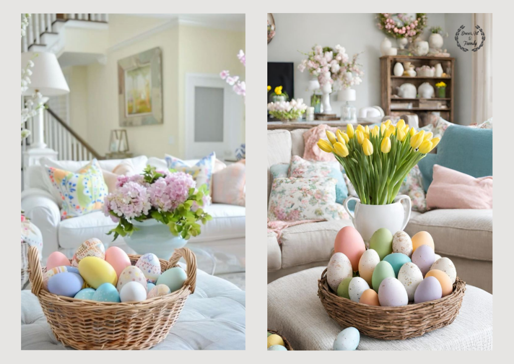 Χρησιμοποιήστε ένα διακοσμητικό μπολ και γεμίστέ το με αυγά σε παστέλ αποχρώσεις και λουλούδια.