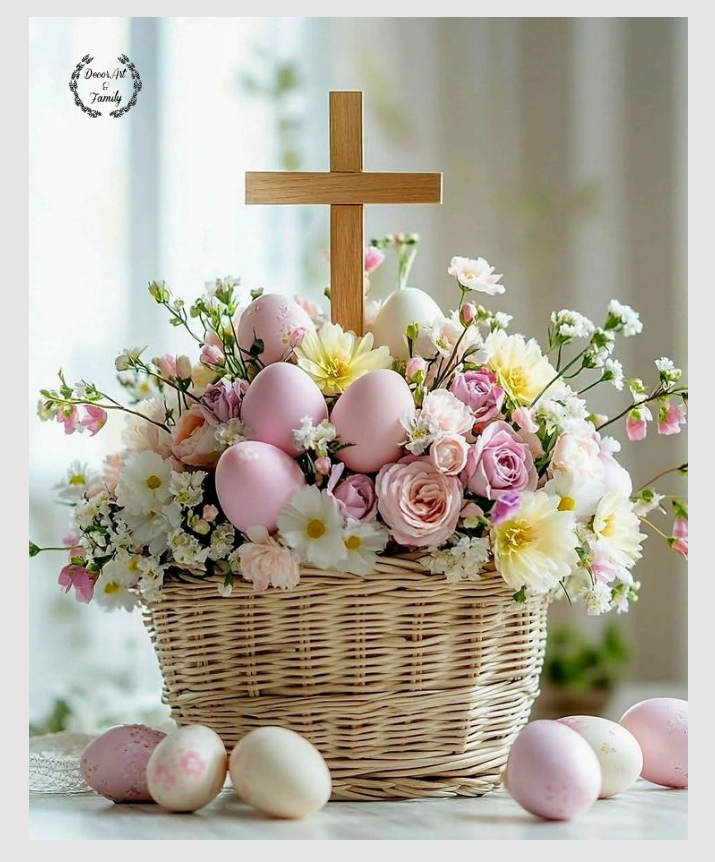 Γεμίστε ένα ψάθινο καλάθι με παστέλ βαμμένα αυγά και λουλούδια εποχής. Η τοποθέτηση ενός ξύλινου σταυρού σηματοδοτεί το Πάσχα!