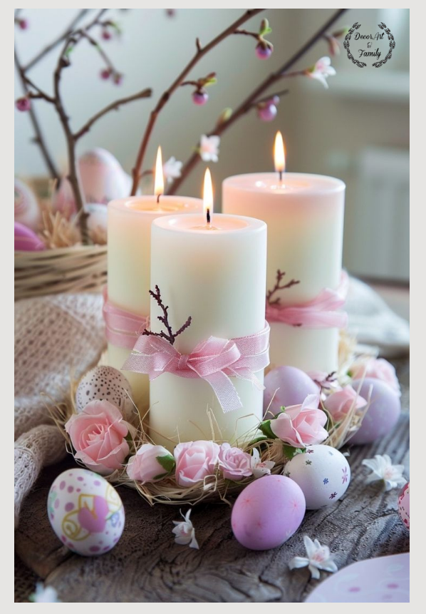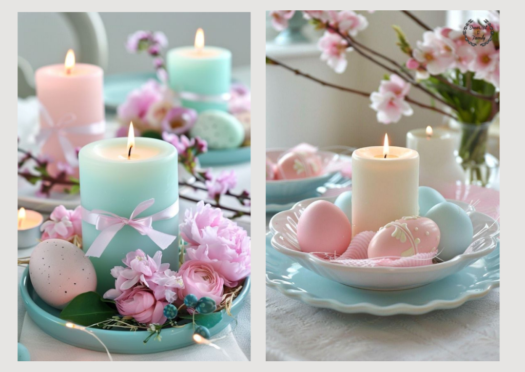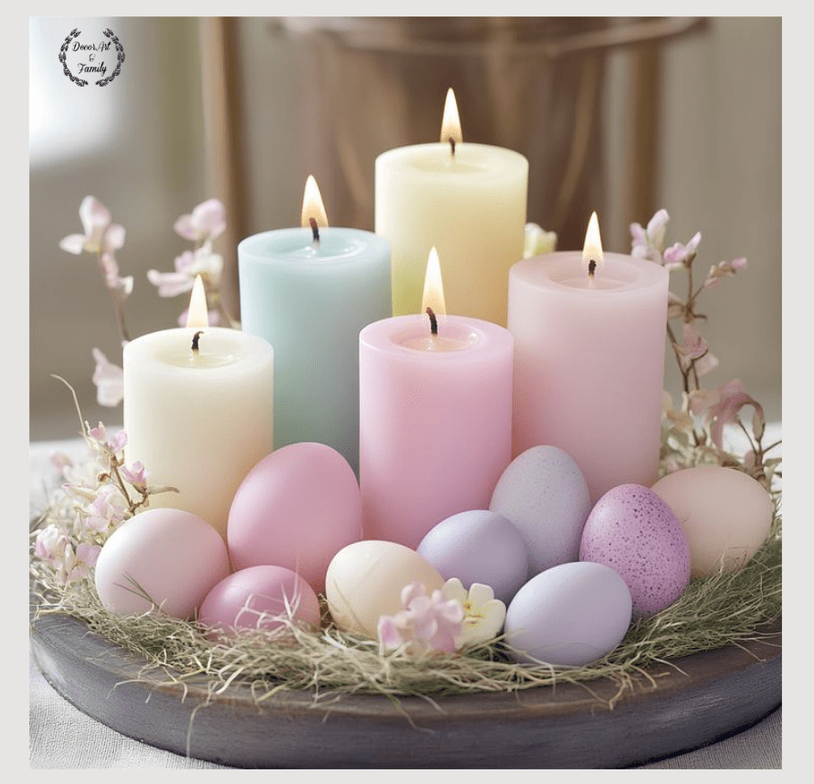 Τοποθετήστε τα αυγά σ’ένα στρογγυλόξύλινο δίσκο με άχυρο ή αποξηραμένα λουλούδια. Δώστε έμφαση με παστέλ κεριά.