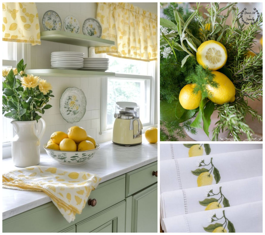 Ένα μπολ με φρέσκα λεμόνια στον πάγκο λειτουργεί ως φυσικό, όμορφο διακοσμητικό.Ένα κερί με άρωμα λεμονιού ή λεμονανθού φέρνει καλοκαιρινή αίσθηση χωρίς υπερβολές.