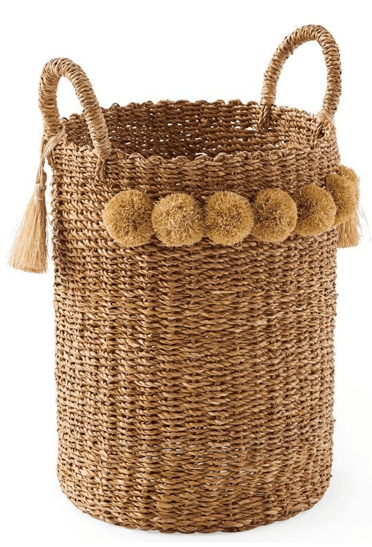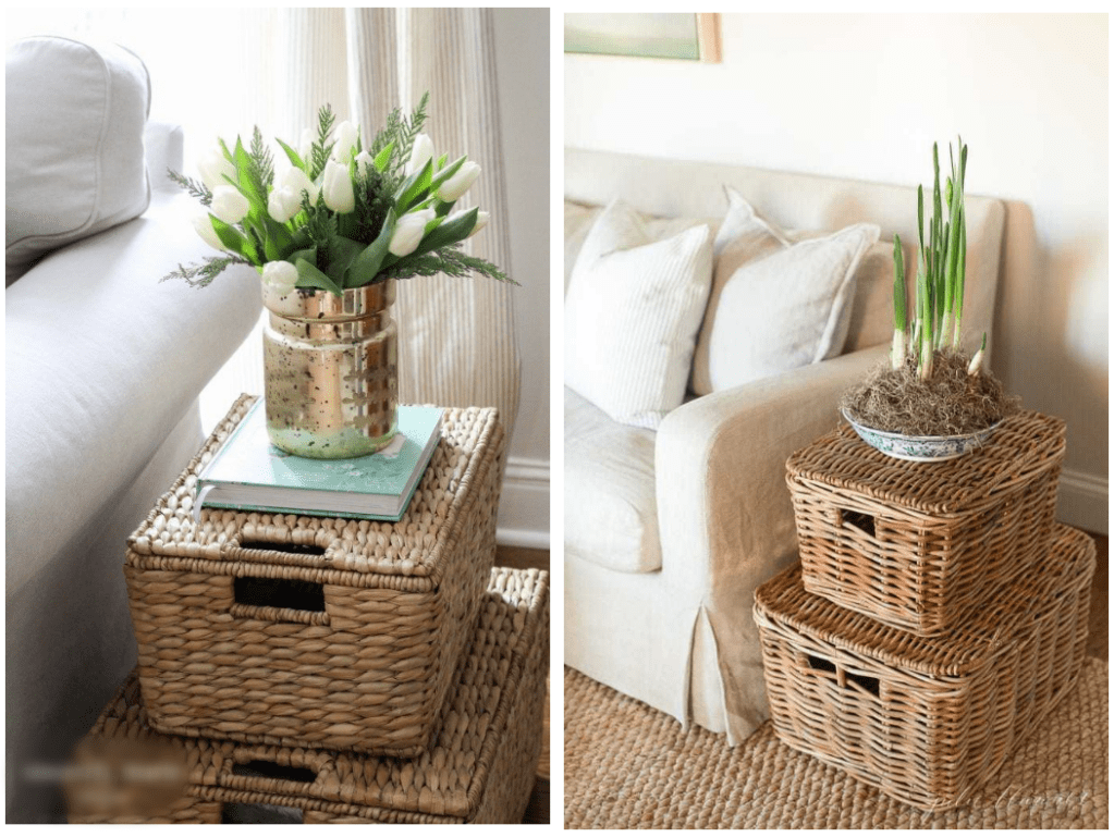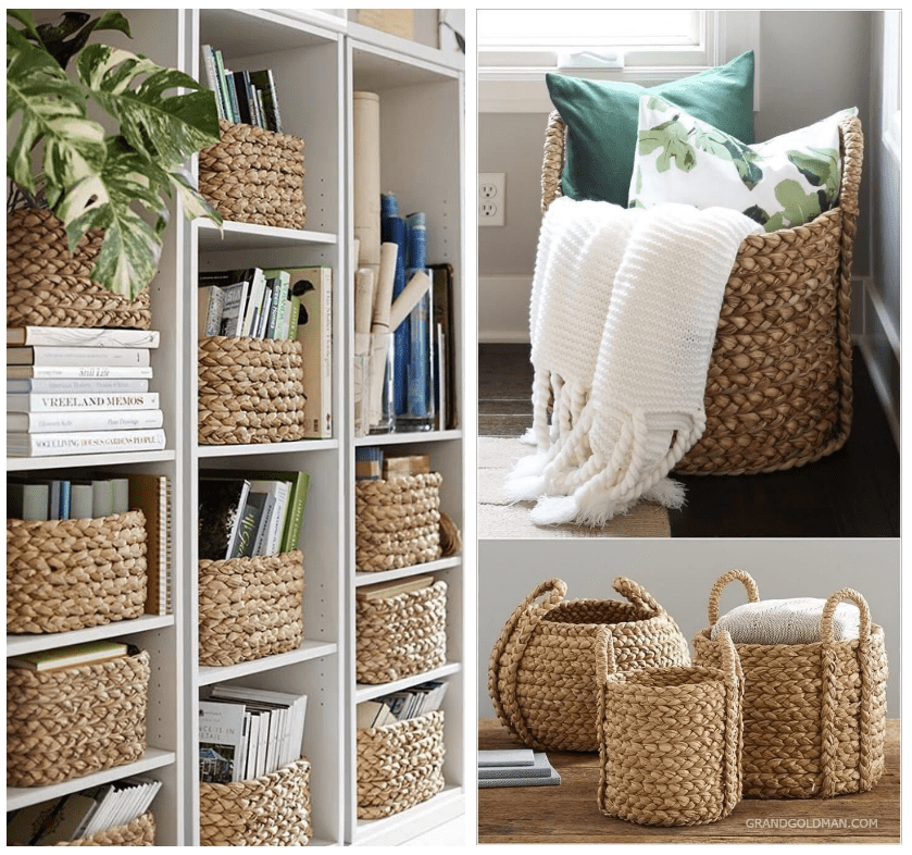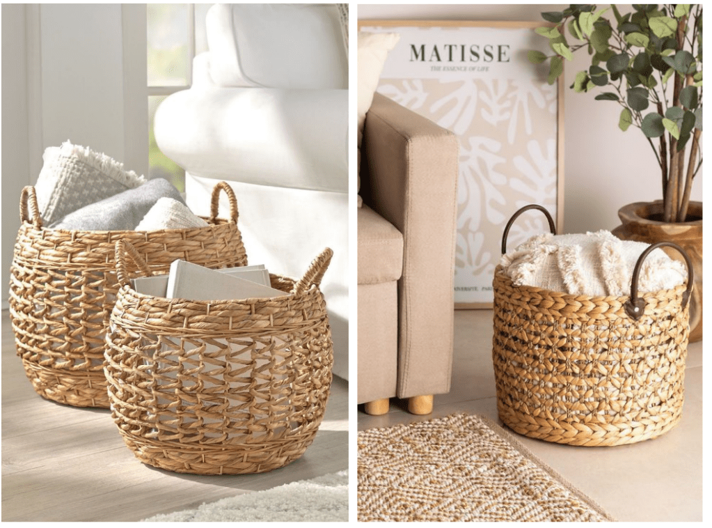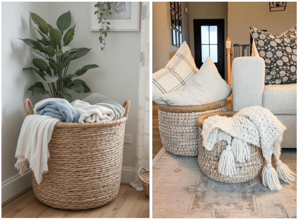 Τα μεγάλα ψάθινα καλάθια είναι ιδανικά για ριχτάρια ή μαξιλάρες – τοποθετούνται δίπλα στον καναπέ και λειτουργούν ως πρακτικό αλλά και στιλάτο στοιχείο διακόσμησης.