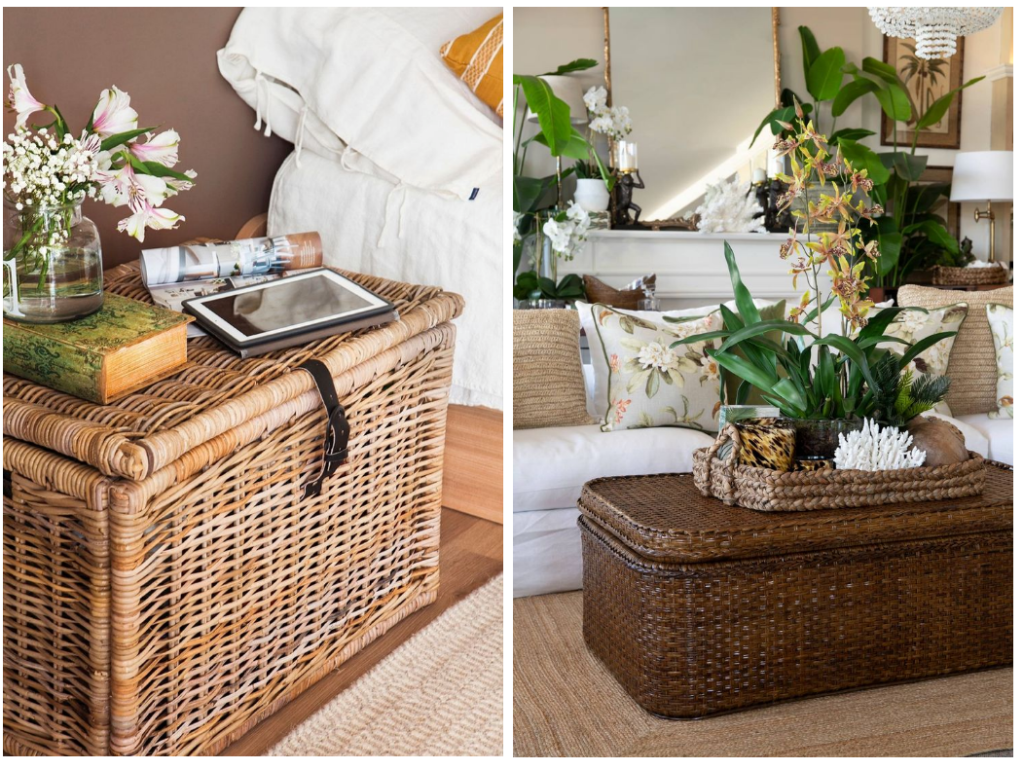 Μεγάλα ψάθινα καλάθια σε στυλ μπαούλου είναι ιδανικά για να κρύβουν κουβέρτες, ριχτάρια ή ακόμα και παιδικά παιχνίδια, κρατώντας το σαλόνι τακτοποιημένο με φυσική κομψότητα.Τοποθετημένα δίπλα στον καναπέ ή κάτω από κονσόλες, προσθέτουν υφή και ζεστασιά στον χώρο ενώ προσφέρουν εύκολη αποθήκευση χωρίς να δείχνουν βαριά.