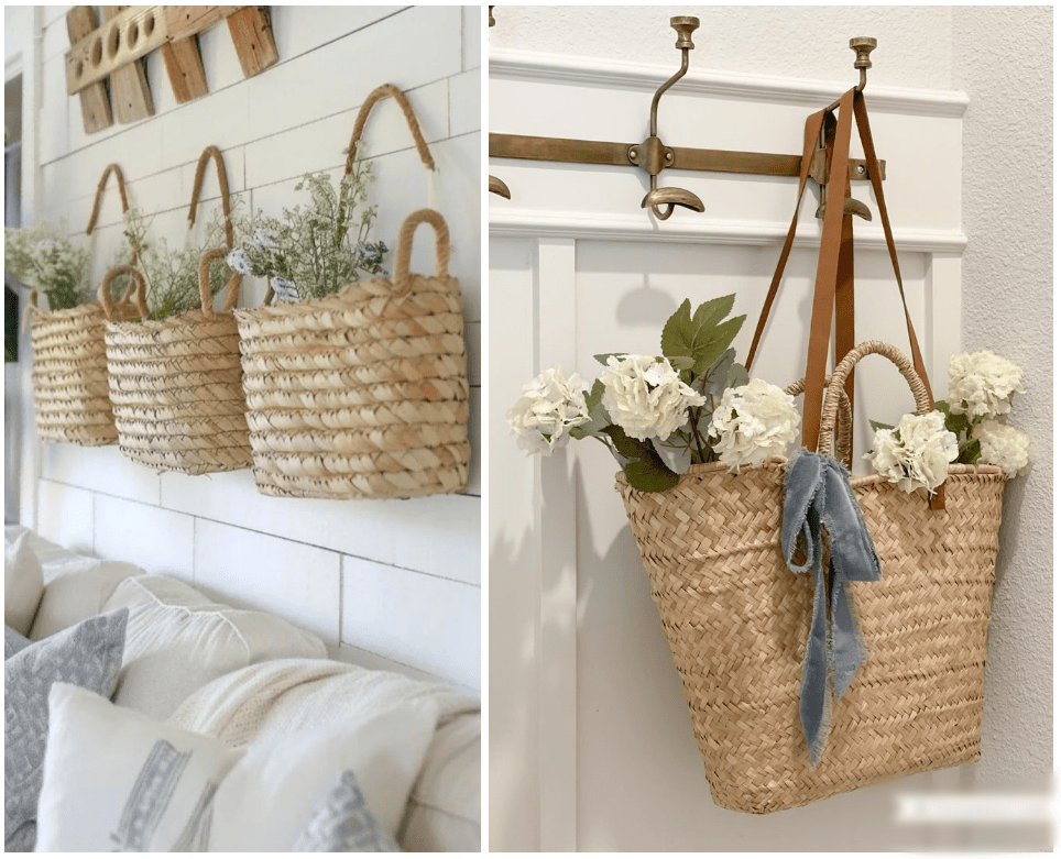 Διακοσμητικές ψάθινες τσάντες, κρεμασμένες σε πόρτες ή τοίχους, γεμάτες λουλούδια ή αποξηραμένα φυτά, είναι ένας απλός τρόπος να «χτίσεις» μια ρουστίκ ή boho ατμόσφαιρα χωρίς κόπο.