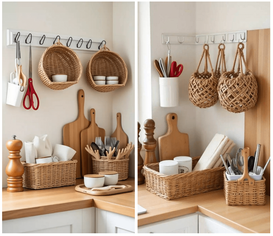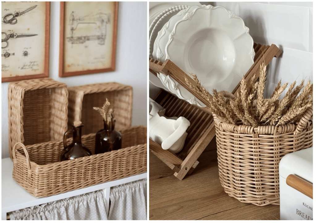 Για οργανωμένη αποθήκευση: Μικρά ψάθινα καλαθάκια μέσα σε ντουλάπια ή ράφια μπορούν να οργανώσουν φακελάκια τσαγιού, καρυκεύματα, πετσέτες κουζίνας ή ακόμη και αξεσουάρ μαγειρικής.