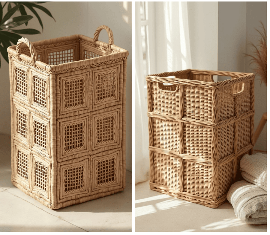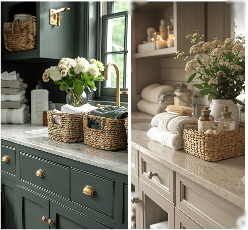 🧴 Για καλλυντικά & προσωπικά είδη: Μικρά ψάθινα καλαθάκια πάνω στον νιπτήρα ή σε ραφάκια είναι ιδανικά για κρέμες, σαπούνια, αρώματα και βουρτσάκια.