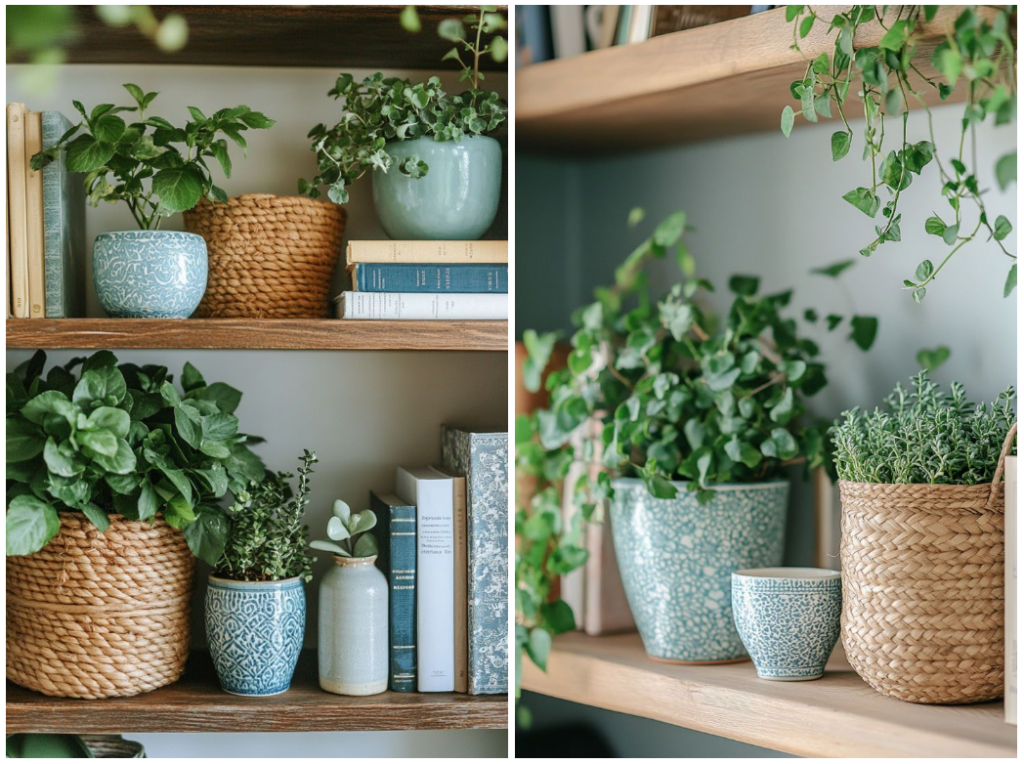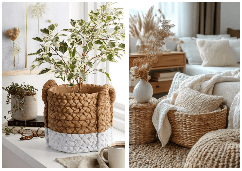 Για μια πιο οργανωμένη αλλά ανεπιτήδευτη αίσθηση, τα ψάθινα καλάθια μπορούν να συνδυαστούν σε διαφορετικά μεγέθη, δημιουργώντας μια αρμονική γωνιά με υλικά εμπνευσμένα από τη φύση.