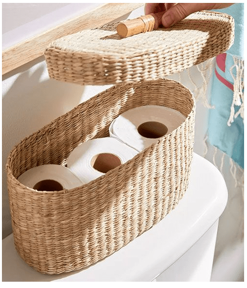 🧻 Για χαρτιά υγείας ή καθαριστικά: Μεγαλύτερα καλαθάκια στο πάτωμα ή κάτω από το νιπτήρα οργανώνουν εύκολα τα πρακτικά, χωρίς να «χαλάνε» την αισθητική.