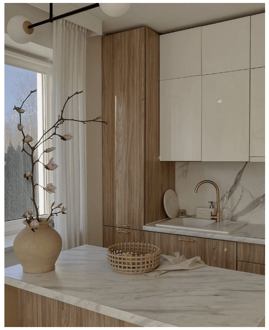 Σ’αυτές τις εικόνες βλέπετε την κουζίνα αποπνέει ζεστασιά και αρμονία. Τα ντουλάπια στο κάτω μέρος είναι από φυσικό ξύλο με όμορφα νερά που φαίνονται καθαρά, ενώ τα πάνω ντουλάπια είναι σε λευκή γυαλιστερή απόχρωση, δίνοντας μια αίσθηση φρεσκάδας και φωτεινότητας. Ο πάγκος και η πλάτη της κουζίνας είναι σε λευκό μάρμαρο με γκρι φλέβες – κλασική επιλογή που δένει τέλεια με το ξύλο.