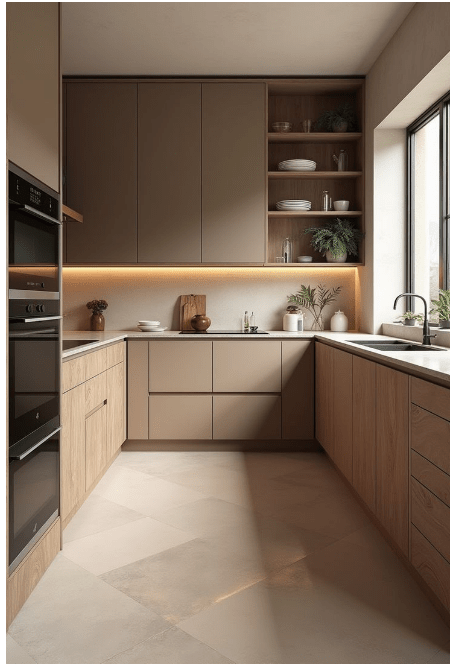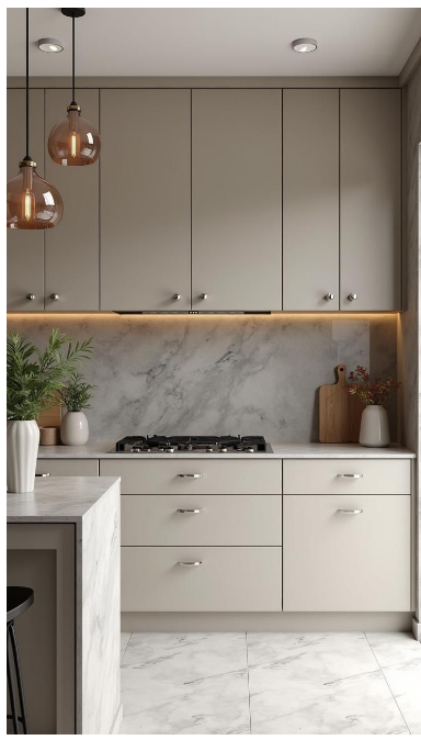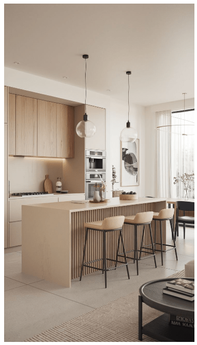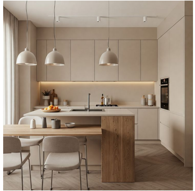 - Λείες μπεζ επιφάνειες χωρίς χερούλια – minimal αισθητική.