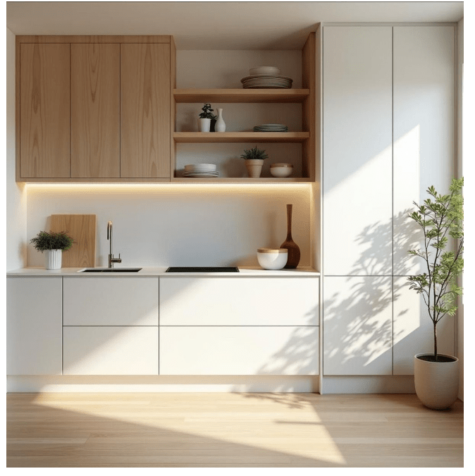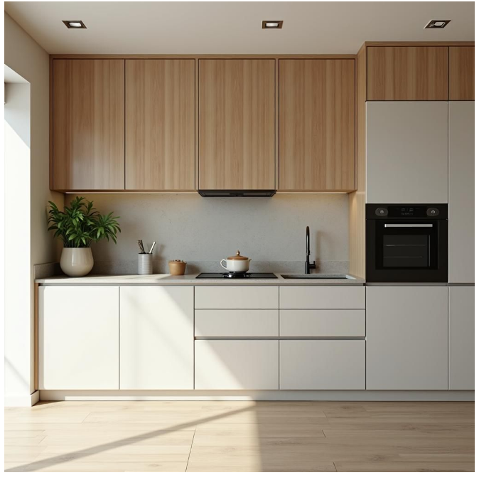 Στις σύγχρονες κουζίνες βλέπουμε συχνά έναν συνδυασμό: λευκά ή μπεζ ντουλάπια στο πάνω μέρος και ξύλινα στο κάτω. Αυτό το «πάντρεμα» δημιουργεί μια αρμονία που είναι και πρακτική και κομψή. Τα λευκά προσφέρουν φρεσκάδα και καθαρότητα, ενώ οι γήινες αποχρώσεις του ξύλου αγκαλιάζουν τον χώρο με ζεστασιά.