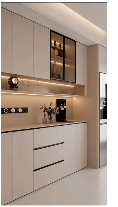 Μια πιο σύγχρονη κουζίνα, που θυμίζει ακόμα και έπιπλο σαλονιού. Τα ντουλάπια είναι σε λείες, μπεζ επιφάνειες χωρίς εμφανείς λαβές, ενώ ανάμεσα στα κλειστά ντουλάπια ξεχωρίζουν ανοιχτά ράφια με φωτισμό LED. Εκεί έχουν τοποθετηθεί ποτήρια, μπουκάλια και διακοσμητικά, δημιουργώντας αίσθηση πολυτέλειας και ζεστής ατμόσφαιρας.