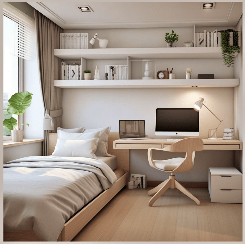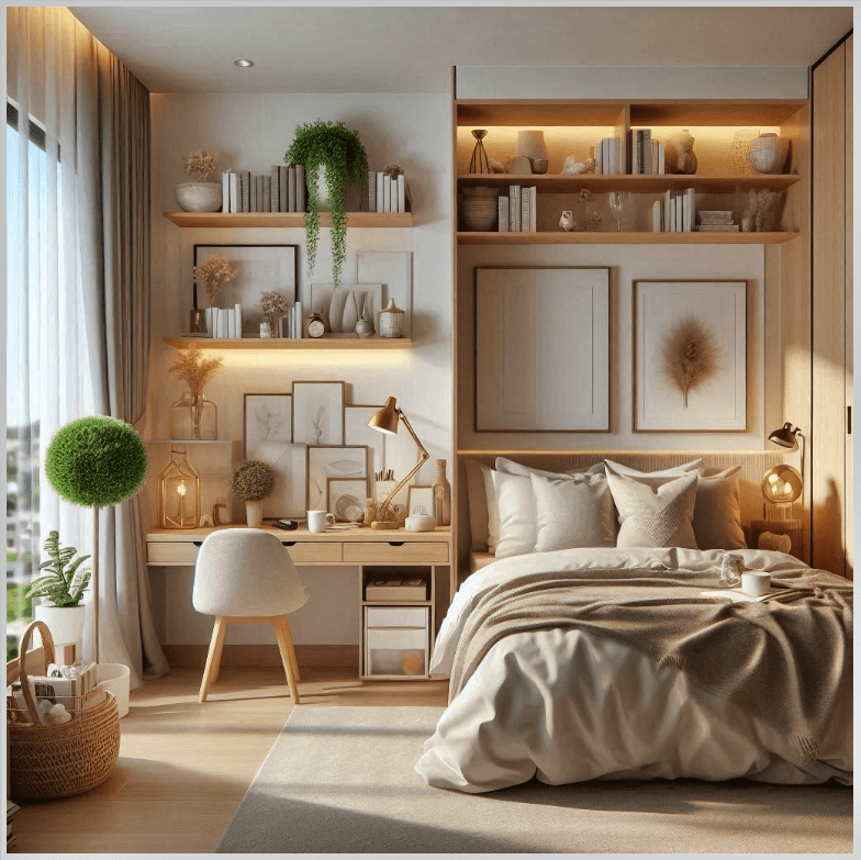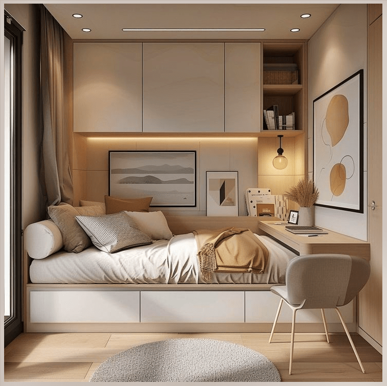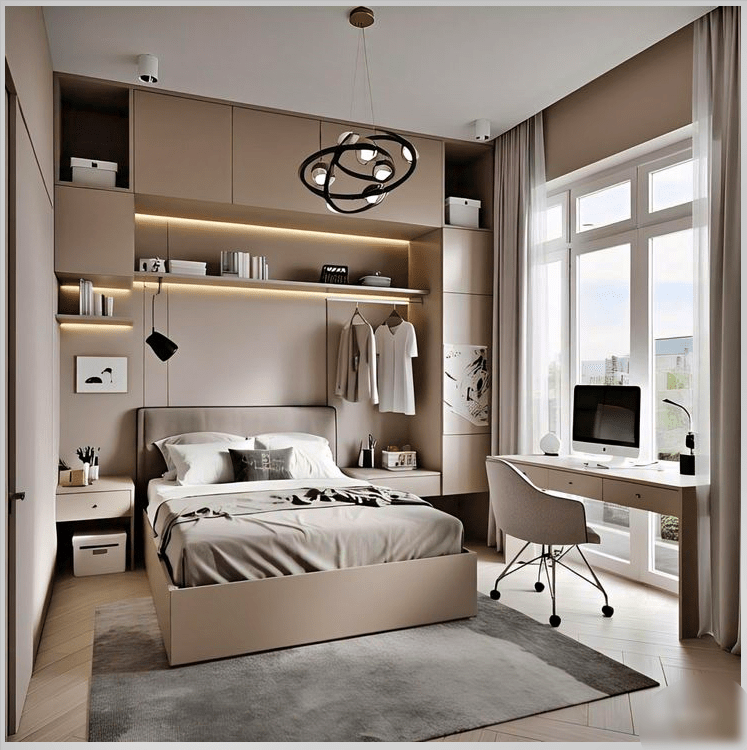Ένα υπνοδωμάτιο που φωνάζει minimal chic! Οι αποχρώσεις του μπεζ αγκαλιάζουν τον χώρο και κάνουν την ατμόσφαιρα ήρεμη και cozy, ενώ οι κρυφοί φωτισμοί δίνουν μια μοντέρνα ζεστασιά. Το γραφείο δίπλα στο παράθυρο είναι ιδανικό για δουλειά με φυσικό φως, κι όλα μοιάζουν να έχουν τη θέση τους – ούτε ένα πράγμα παραπάνω, ούτε ένα λιγότερο.