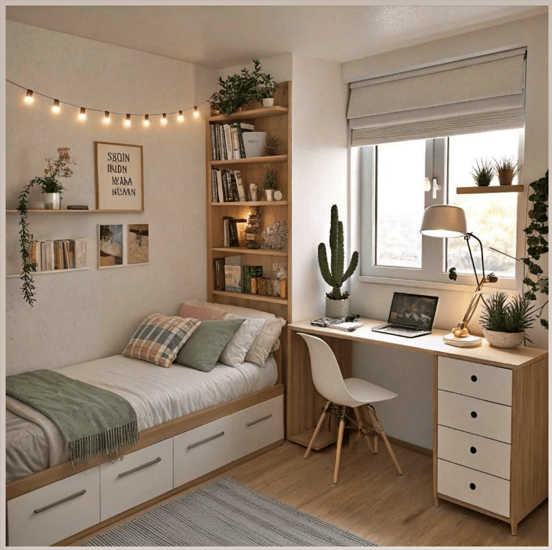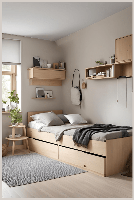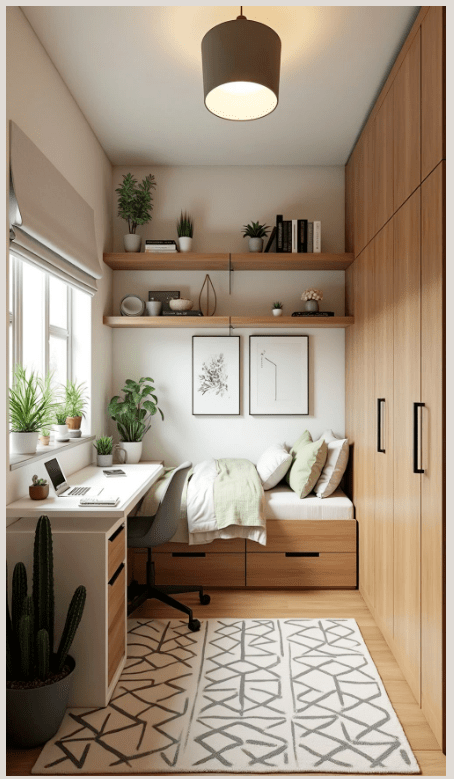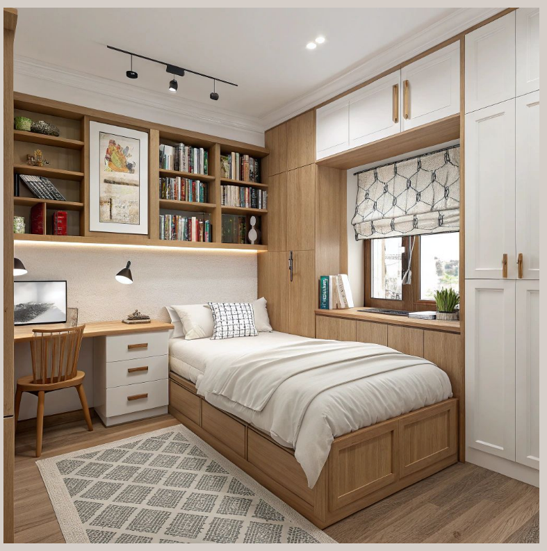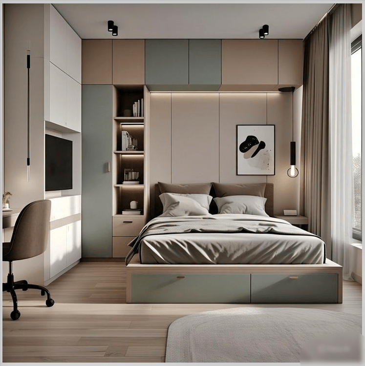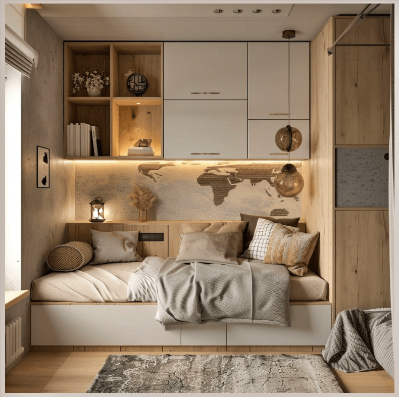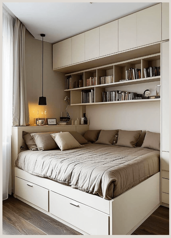 Στα υπνοδωμάτια μικρών διαστάσεων, κάθε εκατοστό μετράει. Στις εικόνες βλέπουμε κρεβάτια ενσωματωμένα σε υπερυψωμένες πλατφόρμες με συρτάρια ή ράφια στη βάση τους. Έτσι, ο χώρος κάτω από το κρεβάτι δεν πάει χαμένος αλλά αξιοποιείται έξυπνα για αποθήκευση. Επιπλέον, οι ντουλάπες και οι κρεμαστές βιβλιοθήκες "αγκαλιάζουν" το κρεβάτι, δημιουργώντας μια ενιαία και αρμονική σύνθεση.
