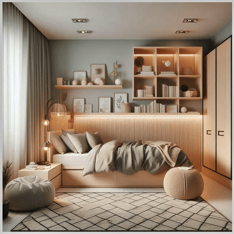 Εδώ έχουμε ένα υπνοδωμάτιο που συνδυάζει πρακτικότητα και στυλ με τον πιο όμορφο τρόπο. Η εντοιχισμένη βιβλιοθήκη και τα ντουλάπια προσφέρουν άπλετο αποθηκευτικό χώρο, ενώ τα χρώματα είναι ήρεμα και ισορροπημένα. Μικρές πινελιές design, όπως ο φωτισμός πάνω από το κρεβάτι και το διακριτικό artwork, δίνουν χαρακτήρα χωρίς να βαραίνουν τον χώρο.
