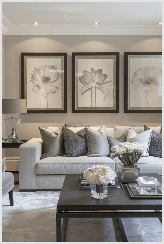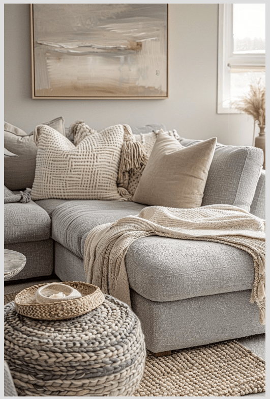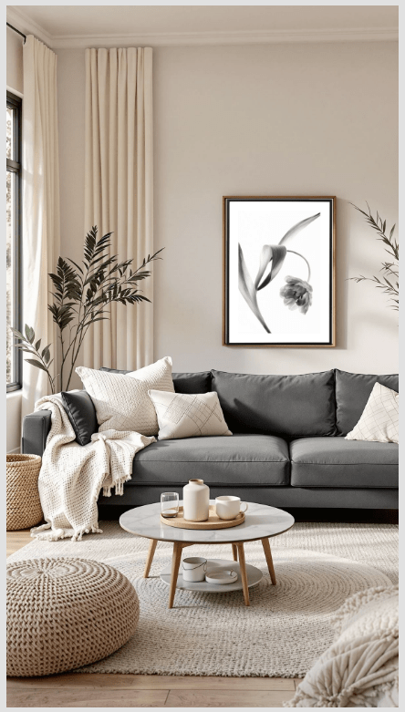 - Καναπές: Ένας γκρι καναπές με cream ριχτάρια ή μαξιλάρια από λινό ή βελούδο δίνει αμέσως πιο φιλόξενο ύφος.