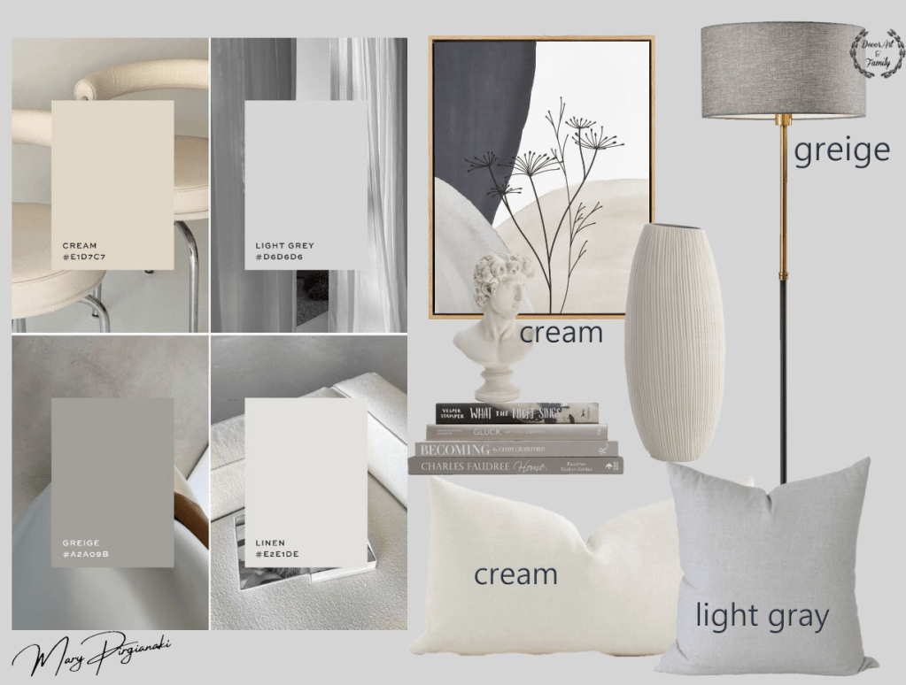 Για να αποφύγεις το «ψυχρό» αποτέλεσμα, πρόσθεσε αποχρώσεις όπως cream, beige ή off-white. Αυτά τα χρώματα «ζεσταίνουν» το γκρι και δημιουργούν μια cozy ατμόσφαιρα.