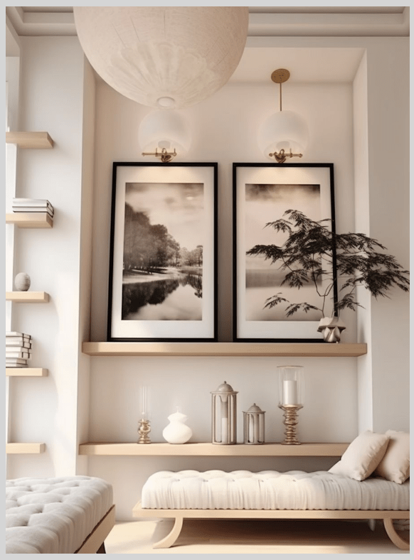 Παίξε με διαφορετικά μεγέθη: ένας μεγαλύτερος πίνακας πίσω κι ένα-δυο μικρότερα μπροστά δημιουργούν layered αποτέλεσμα – σαν gallery χωρίς καμία προσπάθεια.