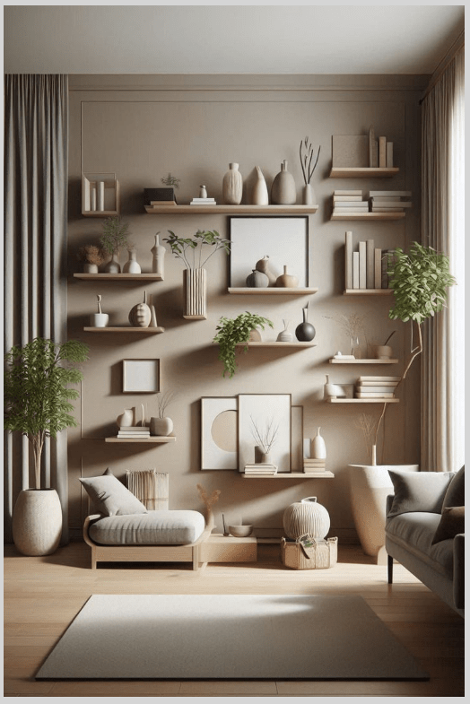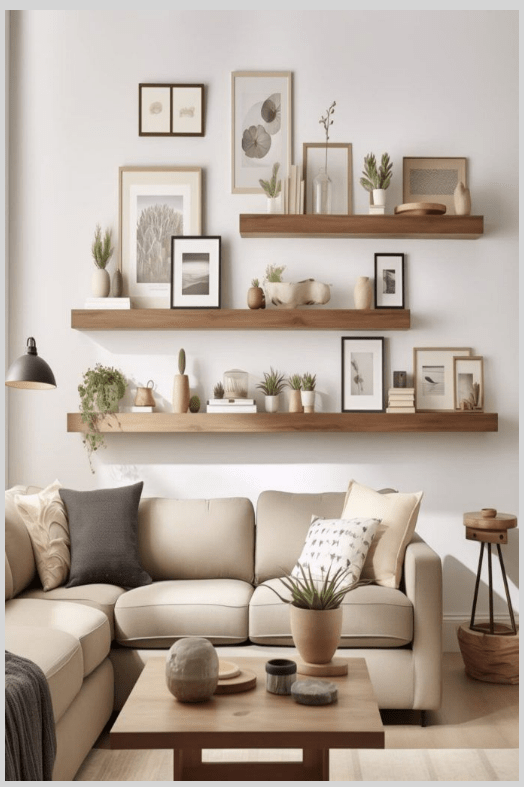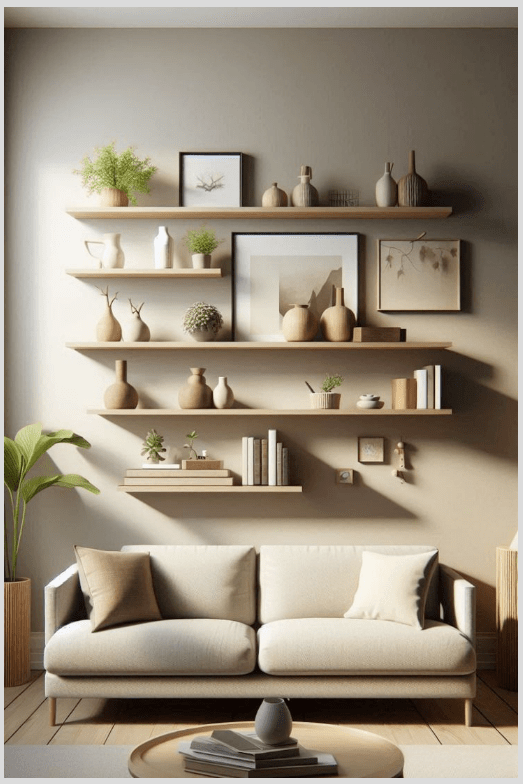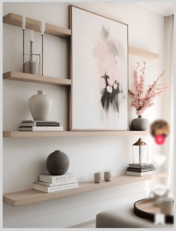 - Διάλεξε floating shelves σε φυσικό ξύλο για να συνεχίσεις την αίσθηση ζεστασιάς.