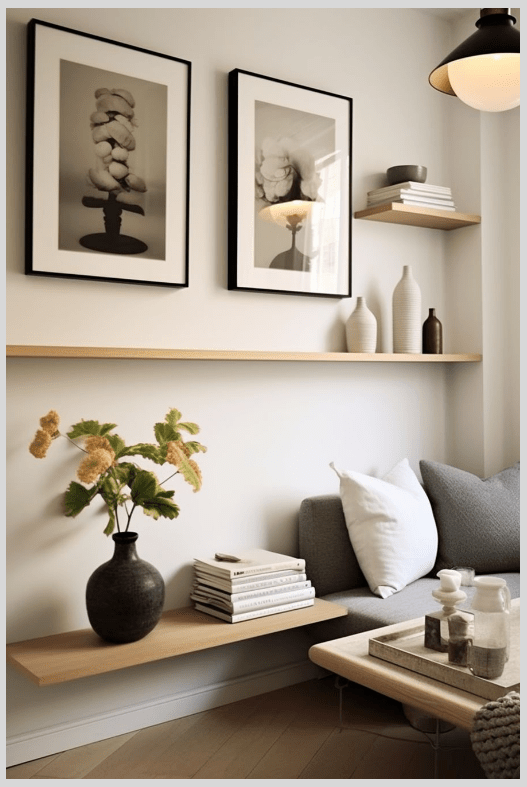 Αν έχεις floating shelves, στήριξε τους πίνακες ακουμπιστά αντί να τους κρεμάσεις· έτσι αλλάζεις διάταξη όποτε θες, χωρίς τρύπες στον τοίχο.