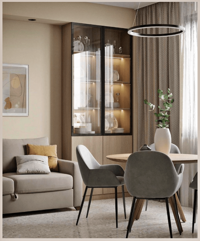 Το φυσικό ξύλο και οι μπεζ αποχρώσεις δίνουν ζεστασιά και μια eco-chic αίσθηση στον χώρο. Μια βιτρίνα σε φυσικό ξύλο μπορεί να «ντυθεί» με πράσινα φυτά, ψάθινα καλάθια και κεραμικά για πιο φυσικό και χαλαρό στυλ.