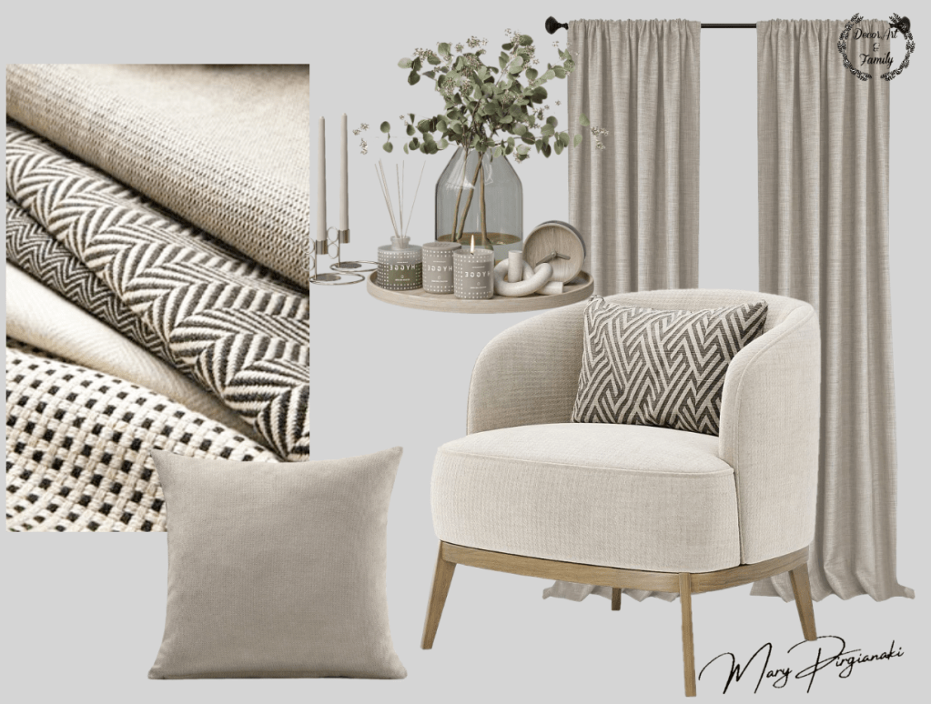 Μέσα από τη διακοσμητική μου εμπειρία, δημιούργησα δικά μου moodboards για την τραπεζαρία, όπου παρουσιάζω πώς οι κουρτίνες μπορούν να “δέσουν” με τα χρώματα του τοίχου, τα φωτιστικά και τα υπόλοιπα στοιχεία του χώρου.