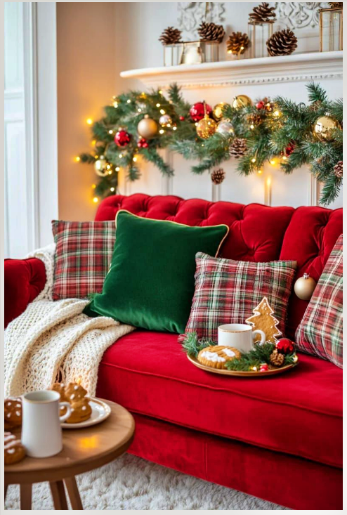 Στο καθιστικό ή το σαλόνι, το ταρτάν μπορεί να γίνει το βασικό στοιχείο που δένει όλη τη χριστουγεννιάτικη διακόσμηση. Ένα καρό ριχτάρι ριγμένο χαλαρά πάνω στον καναπέ, μαξιλαράκια με καρό επένδυση ή ακόμη και μποτάκια και στολίδια με το ίδιο μοτίβο, δημιουργούν μια αίσθηση ζεστασιάς και παράδοσης. Το φως από το τζάκι, τα κεριά και τα λαμπάκια του δέντρου αντανακλούν πάνω στα χρώματα του ταρτάν, γεμίζοντας τον χώρο με μια ήρεμη, οικεία λάμψη.
