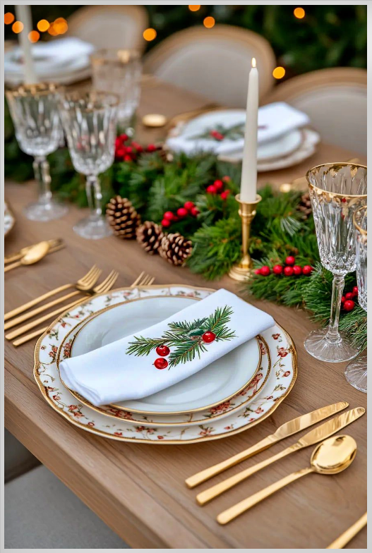 Η χριστουγεννιάτικη διακόσμηση στο τραπέζι δεν χρειάζεται υπερβολές για να γίνει ζεστή και εντυπωσιακή. Με λευκά σερβίτσια ή με κάποιο διακριτικό μοτίβο, το στρώσιμο αποκτά μια κομψή και καθαρή βάση που ταιριάζει σε κάθε γιορτινή ατμόσφαιρα. Τα κρυστάλινα ποτήρια δίνουν μια φωτεινή λάμψη, ενώ τα χρυσά μαχαιροπίρουνα –ή και τα απλά ανοξείδωτα– ολοκληρώνουν την εικόνα με τρόπο εκλεπτυσμένο αλλά φιλικό.