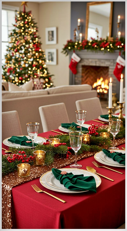 Η πράσινη βελούδινη τραβέρσα προσθέτει κομψότητα και μια πιο πολυτελή πινελιά, δημιουργώντας ιδανικό φόντο για χρυσαφένιες λεπτομέρειες και κρυστάλλινα ποτήρια, κάνοντας το γιορτινό τραπέζι να δείχνει πραγματικά ξεχωριστό.