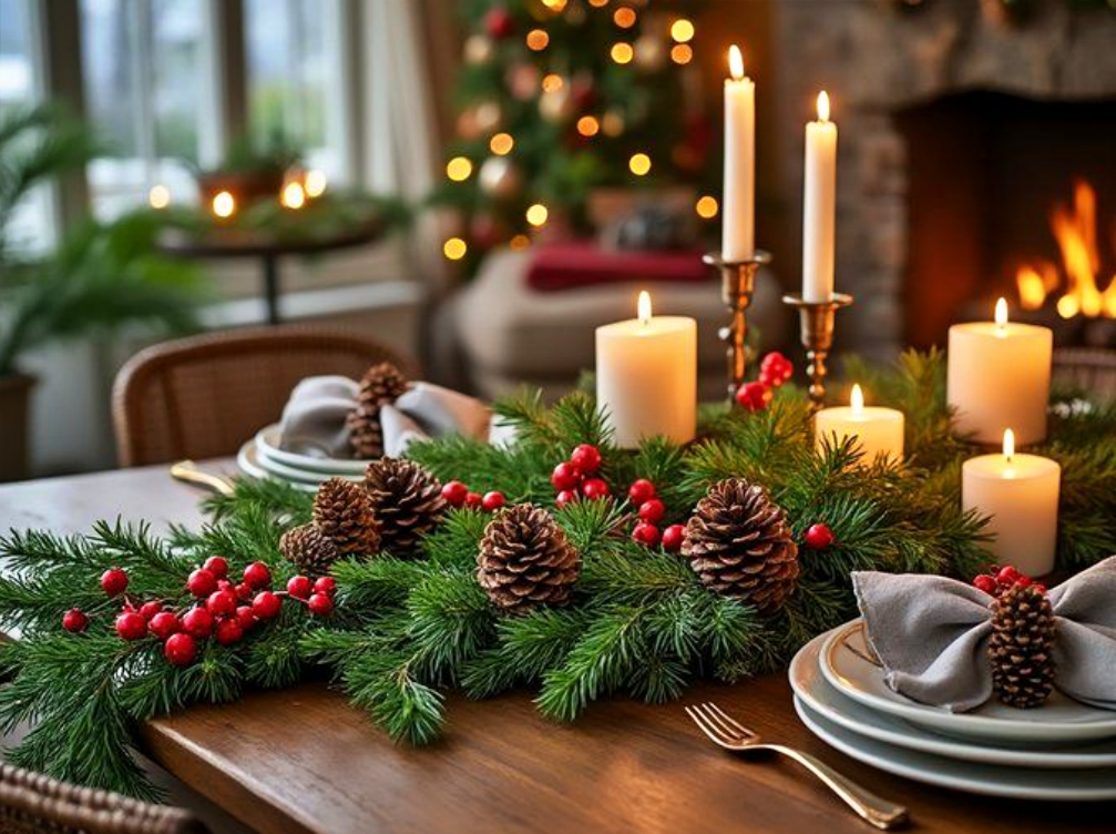 Μια σύνθεση από κουκουνάρες, κλαδιά πεύκου και όμορφα αναμμένα κεριά στο κέντρο του τραπεζιού δημιουργεί αμέσως ένα ζεστό, φυσικό και απόλυτα γιορτινό περιβάλλον.Τα κλαδιά πεύκου, με την χαρακτηριστική τους μυρωδιά, ενισχύουν την αίσθηση της φύσης, ενώ οι κουκουνάρες προσθέτουν μια rustic υφή Τα αναμμένα κεριά, με το απαλό τους φως, δημιουργούν μια ατμόσφαιρα οικεία και ζεστή, προσκαλώντας τους καλεσμένους να νιώσουν άνετα και ευχάριστα. Όταν συνδυάζονται όλα αυτά τα στοιχεία, το τραπέζι γίνεται το επίκεντρο της γιορτής, προσφέροντας μια μοναδική εμπειρία που συνδυάζει την παράδοση με τη σύγχρονη αισθητική.