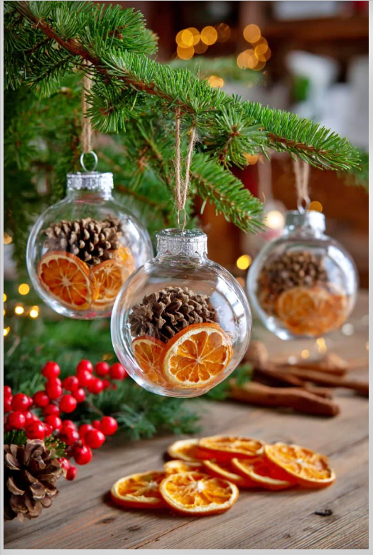 Αν αγαπάς τις φυσικές, αρωματικές και ζεστές χριστουγεννιάτικες διακοσμήσεις, τότε οι διάφανες χριστουγεννιάτικες μπάλες γεμισμένες με αποξηραμένο πορτοκάλι, γλυκάνισο, κανέλα, μικρά κλαδάκια και κουκουνάρια είναι η απόλυτη επιλογή. Πρόκειται για στολίδια που συνδυάζουν φυσική ομορφιά, χειροποίητο χαρακτήρα και παραδοσιακή γιορτινή ατμόσφαιρα.