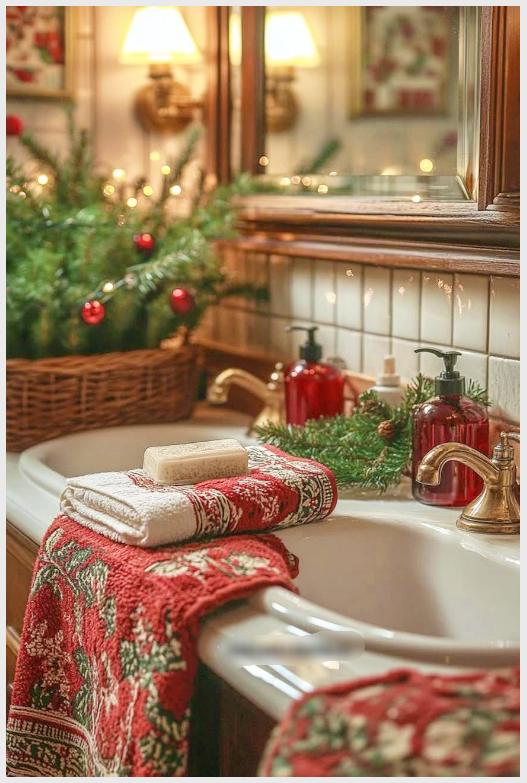 Η χριστουγεννιάτικη διακόσμηση δεν περιορίζεται μόνο στο σαλόνι ή την είσοδο του σπιτιού. Ένα όμορφα στολισμένο μπάνιο μπορεί να μεταφέρει την ίδια ζεστασιά και εορταστική αίσθηση, δημιουργώντας μια φιλόξενη ατμόσφαιρα για εσένα και τους επισκέπτες σου. Οι λεπτομέρειες είναι αυτές που κάνουν πραγματικά τη διαφορά — και στο μπάνιο, αυτές οι μικρές πινελιές μπορούν να αναδείξουν εντυπωσιακά τον χώρο.
