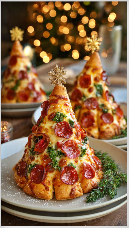 Για μια πιο παιχνιδιάρικη και δημοφιλή επιλογή, φτιάξτε κομμάτια πίτσας σε σχήμα δεντράκι. Ανοίξτε τη ζύμη και κόψτε την με κουπ πατ ή με μαχαίρι ώστε να σχηματίσετε μικρά δέντρα πριν μπει στον φούρνο. Προσθέστε τη σάλτσα, το τυρί και τα υλικά της επιλογής σας – π.χ. πιπεριά, μανιτάρια, σαλάμι – και ψήστε μέχρι να γίνουν τραγανά και λαχταριστά. Για περισσότερη χριστουγεννιάτικη διάθεση, στολίστε το «δέντρο» με μικρές κουκίδες από κόκκινη πιπεριά ή καλαμπόκι, και στην κορυφή βάλτε ένα αστεράκι από τυρί. Είναι ιδανικά για πάρτι, μπουφέ και παιδικά γεύματα!
