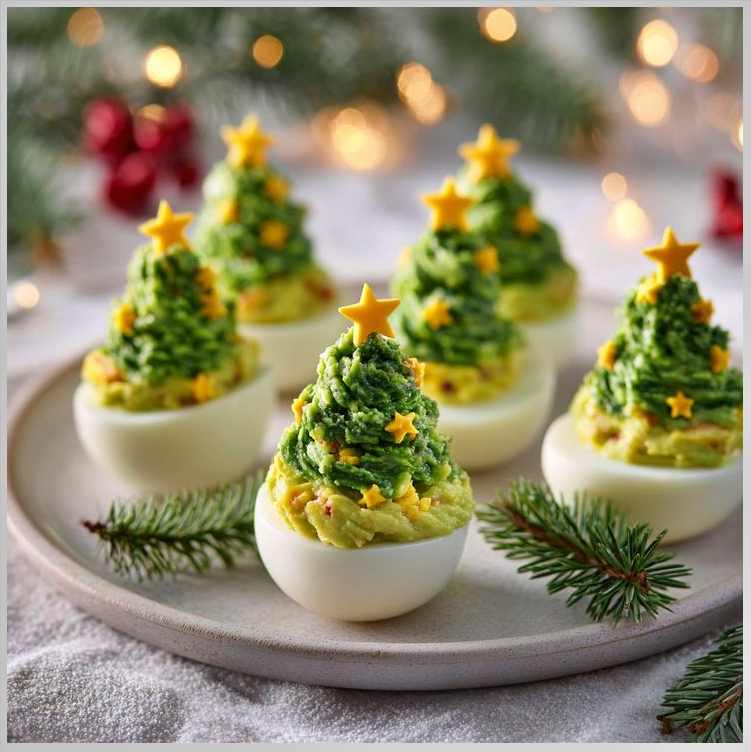 Μια πρωτότυπη και εντυπωσιακή ιδέα για το γιορτινό τραπέζι είναι να χρησιμοποιήσετε βραστά αυγά ως βάση και να δημιουργήσετε από πάνω μια μικρή «κορυφή δέντρου» με pesto. Κόψτε τα αυγά στη μέση, προσθέστε μια απαλ pesto –όπως τυροκαυτερή, αβοκαντοκρέμα, ή μια πράσινη κρέμα με άνηθο και ελαφρύ τυρί– και με τη βοήθεια ενός κορνέ σχηματίστε μικρά, αφράτα δεντράκια. Μπορείτε να στολίσετε με λίγους κόκκους ροζ πιπεριού ή ψιλοκομμένη κόκκινη πιπεριά για να θυμίζουν μικρές χριστουγεννιάτικες μπάλες. Το αποτέλεσμα είναι γιορτινό, φρέσκο και πολύ εντυπωσιακό!