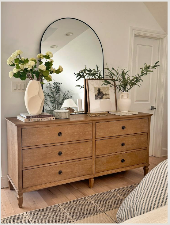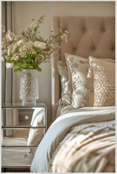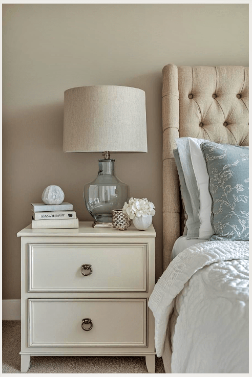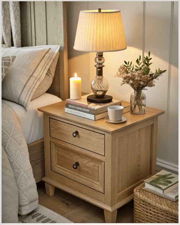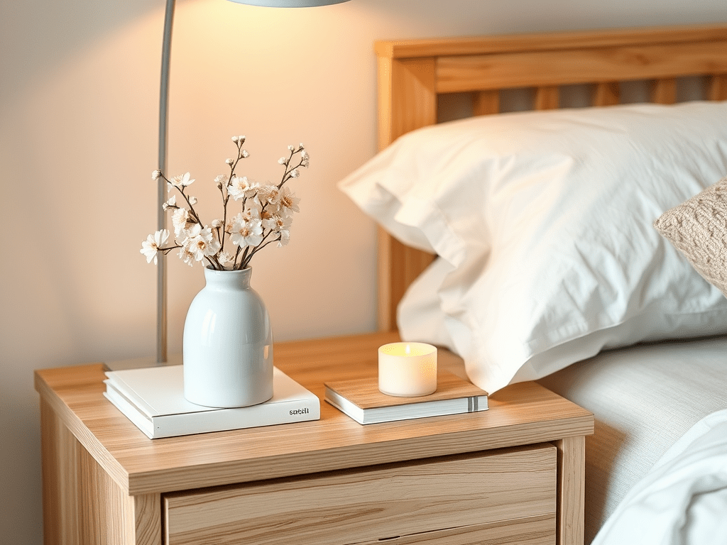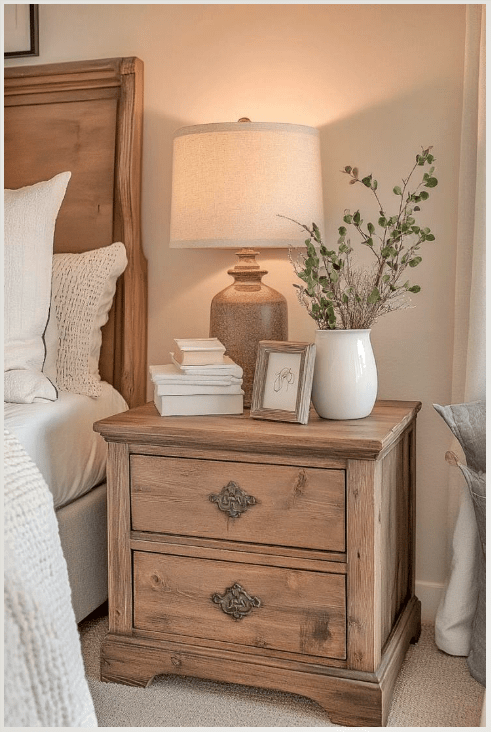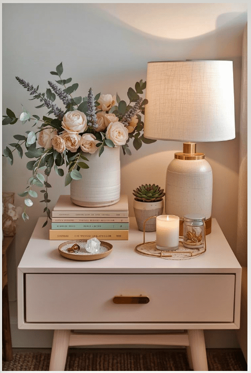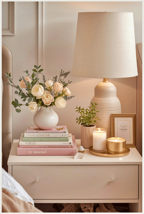 Μικρά διακοσμητικά, όπως ένα κερί, ένα βάζο με λουλούδια ή ένα αντικείμενο με συναισθηματική αξία, αρκούν για να κάνουν το κομοδίνο πιο «ζωντανό». Ένας μικρός δίσκος μπορεί να βοηθήσει στην οργάνωση, κρατώντας τα αντικείμενα συγκεντρωμένα και το σύνολο πιο καθαρό οπτικά.