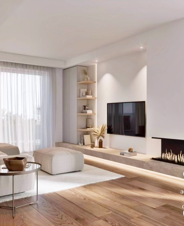 Ο συνδυασμός χαμηλού επίπλου, επιτοίχιων ραφιών και τζακιού δημιουργεί ένα μοντέρνο, λιτό αλλά ιδιαίτερα εντυπωσιακό αποτέλεσμα στο καθιστικό. Το χαμηλό έπιπλο κρατά τον χώρο καθαρό και ισορροπημένο, λειτουργώντας ως διακριτική βάση, ενώ τα επιτοίχια ράφια προσθέτουν ελαφρότητα και επιτρέπουν προσωπικές πινελιές χωρίς να βαραίνουν τη σύνθεση. Το τζάκι γίνεται το σημείο αναφοράς του χώρου, χαρίζοντας ζεστασιά και ατμόσφαιρα. Όλα μαζί συνθέτουν ένα σύνολο σύγχρονο και κομψό, που εντυπωσιάζει χωρίς υπερβολές.