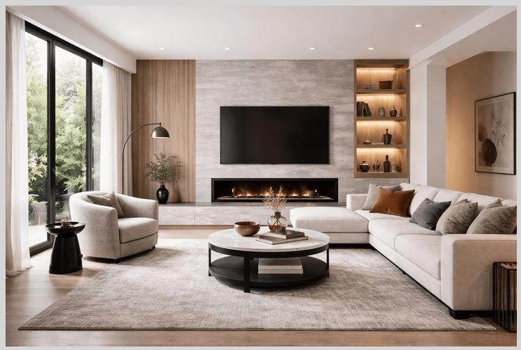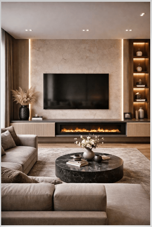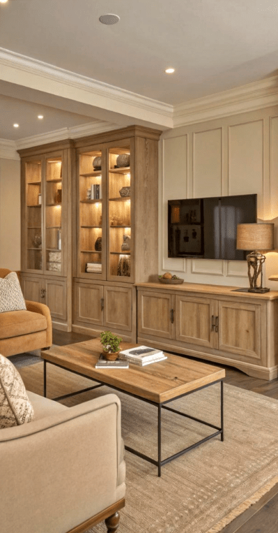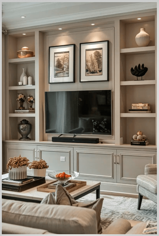 Από την άλλη πλευρά, οι πιο σύνθετες συνθέσεις μπορούν να δώσουν χαρακτήρα και προσωπικότητα στο σαλόνι. Έπιπλα με βιτρίνες στο πλάι, επιτοίχια ράφια ή συνδυασμό κλειστών και ανοιχτών αποθηκευτικών χώρων δημιουργούν ένα ολοκληρωμένο σύνολο. Εκεί η τηλεόραση γίνεται μέρος μιας μεγαλύτερης εικόνας, πλαισιωμένη από βιβλία, κεραμικά ή διακοσμητικά στοιχεία που αντικατοπτρίζουν το προσωπικό στυλ του χώρου.