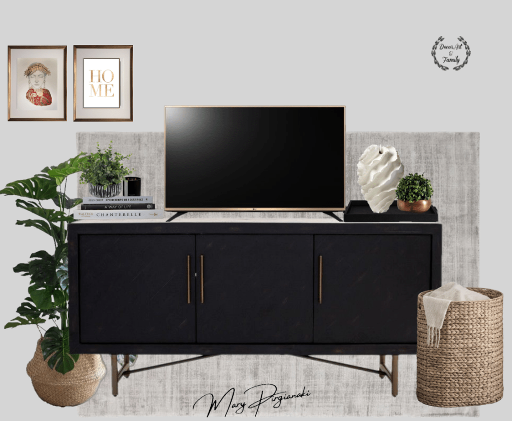Αυτό το moodboard είναι η δική μου προσέγγιση στην τοποθέτηση της τηλεόρασης στο καθιστικό, μέσα από τη δική μου αισθητική. Ήθελα η τηλεόραση να ενσωματώνεται στον χώρο και όχι να τον κυριαρχεί. Το μαύρο έπιπλο με τις καθαρές γραμμές λειτουργεί ως σταθερή βάση, προσθέτοντας κομψότητα και βάθος, ενώ οι λεπτομέρειες σε μεταλλικές αποχρώσεις ζεσταίνουν το αποτέλεσμα χωρίς να το βαραίνουν.Τα διακοσμητικά στοιχεία είναι επιλεγμένα με σκοπό να δημιουργούν ισορροπία και χαρακτήρα. Φυτά για φυσική ανάσα, βιβλία για προσωπικότητα, κεραμικά με απαλές φόρμες για υφή και ηρεμία. Τίποτα δεν είναι τυχαίο, αλλά τίποτα δεν δείχνει «στημένο». Το φόντο παραμένει ήρεμο, ώστε το σύνολο να αναπνέει και να αφήνει χώρο στην καθημερινότητα.